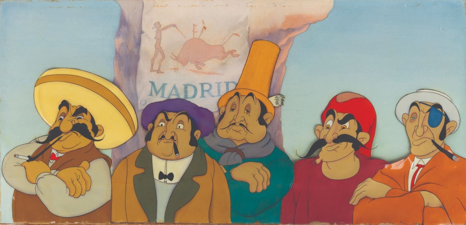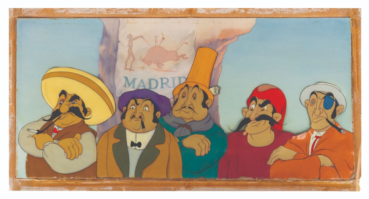 (Disney, 1938) Original production cels and matching pan production background from the 1938 Academy Award-Winning Walt Disney Short, "Ferdinand The Bull." The cels of "The Men with Funny Hats" have each been trimmed to image and applied to the matching pan production background as prepared at the studio for presentation or a gift. The total image size of the characters is 21” x 8.5”, and the background measures 21.25” x 10.25”. The artwork displays in very good condition with some chipping to the bottom edge of the cels and marks from adhesive from a previous matte around the edges. A hairline crack in the background into the left side is mostly obscured by the cel, only visible for .25”. An exceptional cel and background from this important short.