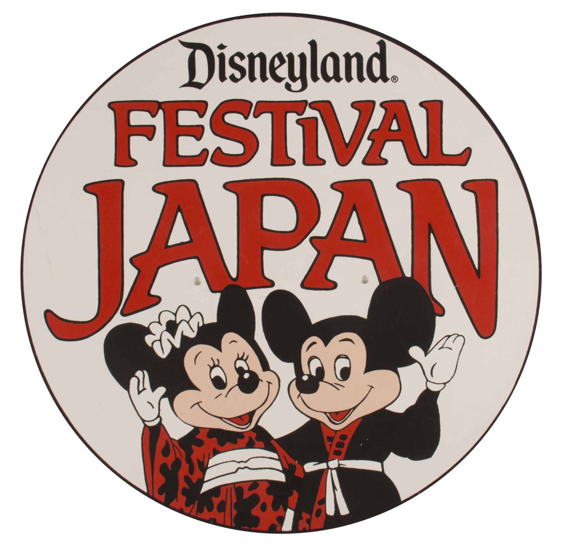 (Disneyland, 1985) An original lamppost sign from Disneyland's Festival Japan in 1985. Featuring charming imagery of Mickey and Minnie in traditional Japanese attire, the sign is printed on sturdy PVC board and measures 15.75" in diameter. The condition is good with a few surface scratches from use. An original COA from the Disneyana store on Main Street is included.