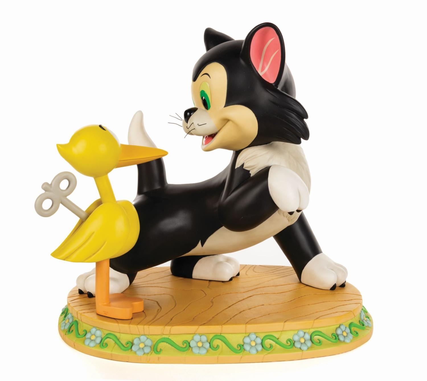 (Disney, c.2010) An exclusive Limited Edition Figaro Disney Big Fig. The three-piece collectable display features Figaro the tuxedo cat (popularized by Walt Disney's Pinocchio) preserved larger than life alongside a wind-up bird, atop a base resembling Gepetto's Toy Shop floor. Limited to an edition of 250, the resin Disney Auctions Big Fig set was hand painted. Figaro measures, 18" long, 17" tall, 9" wide, while the bird toy figure measures 11.5" tall and 8.5" wide. Measuring 21"x13.75", the display base features a wood-grain pattern and floral relief, backstamp information under base, and a fixed peg for poising the bird toy figure. Figures and base are in fine condition with minor wear from display.