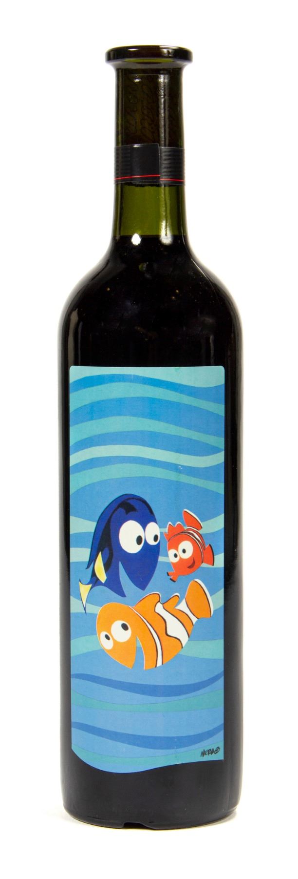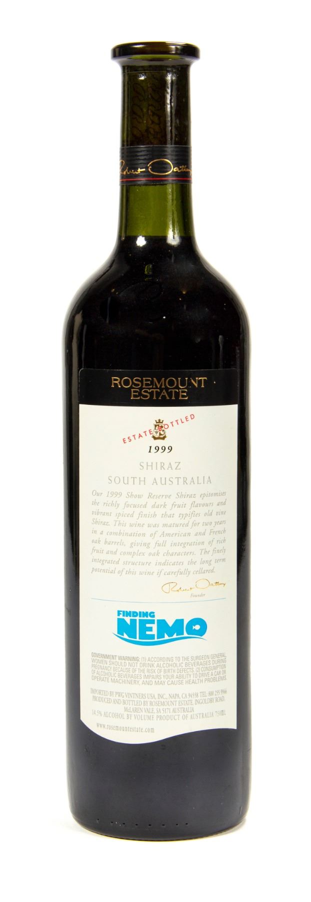 (Pixar, 2003) A bottle of Rosemount Estate 1999 Show Reserve Shiraz with custom Finding Nemo label art by Pixar animator Ricky Nieva. Bottles like this were gifted by Pixar chief and noted oenophile John Lasseter to cast and crew on the film. The Shiraz is sealed and waxed in a standard 750mL bottle which measures 12.25” tall and 3” in diameter. It is in very fine condition with only minor shelf wear.