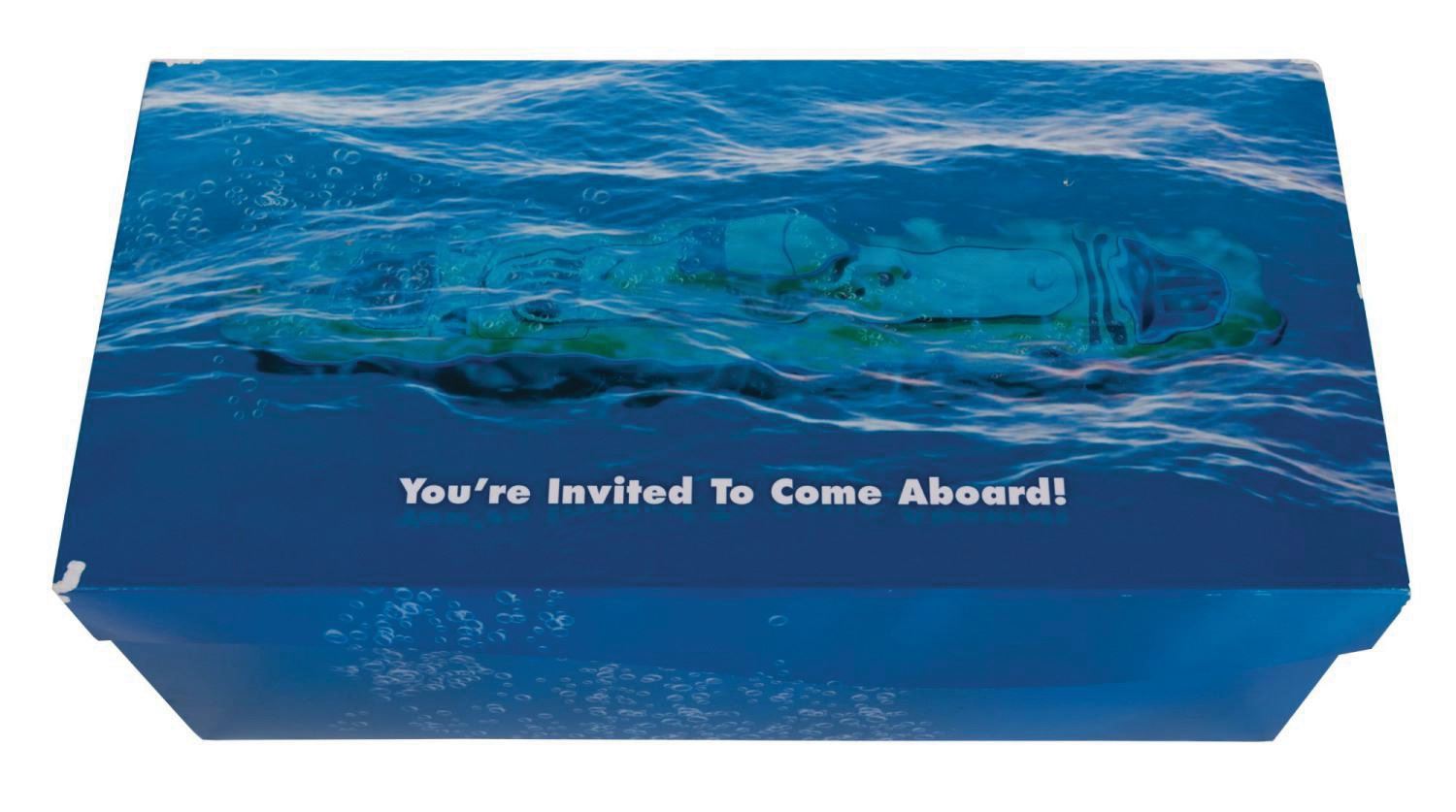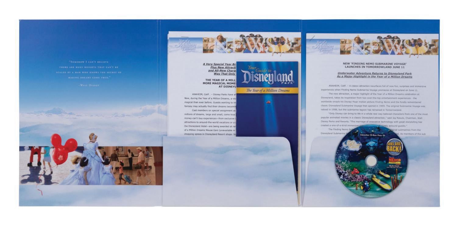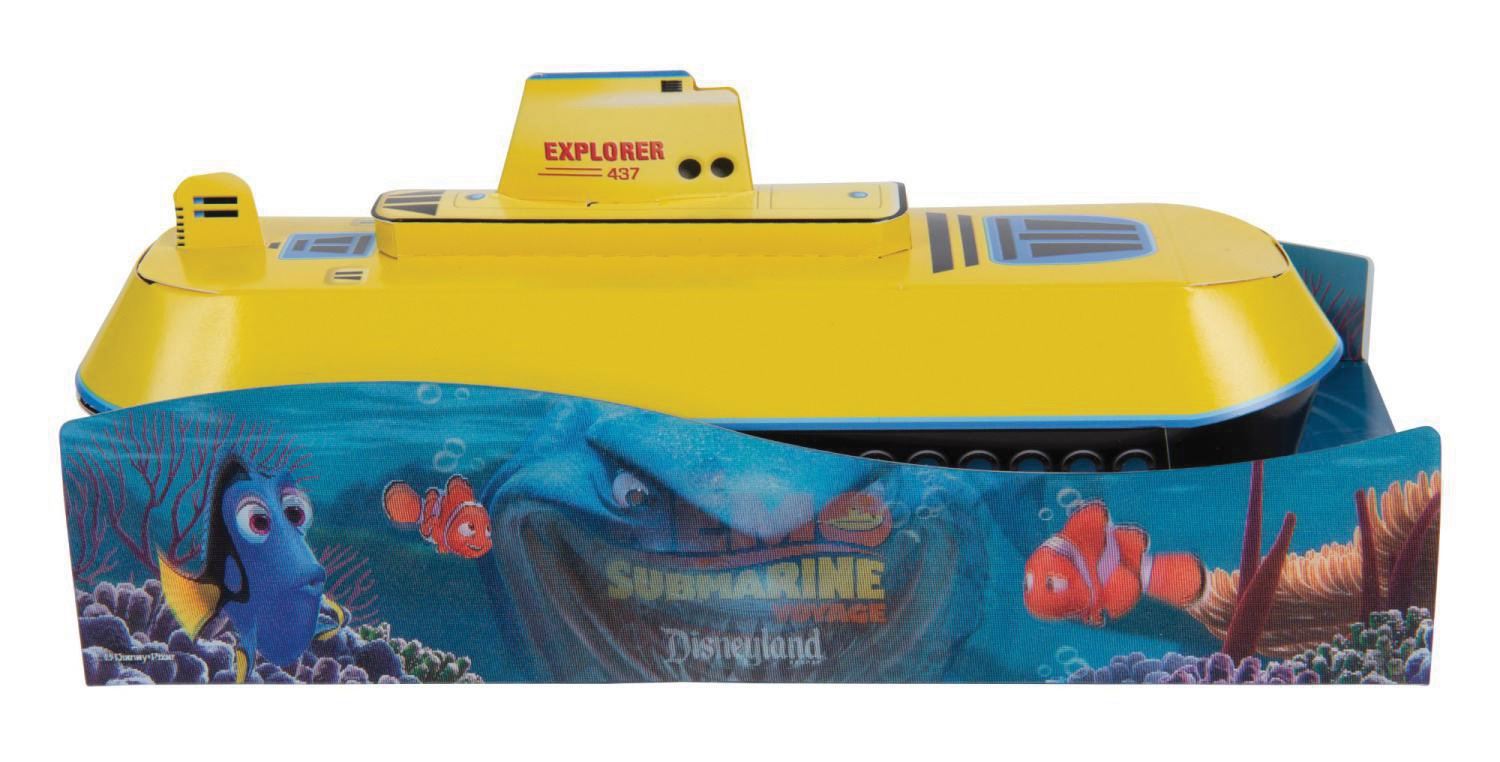 (Disneyland, 2006-07) A press kit and invitation to the Premier Party for the new Finding Nemo Submarine Voyage attraction at Disneyland on June 10, 2007. The chest contains a dimensional pop-up submarine boat, and it retains the original R.S.V.P. invitation for the "resurfacing" of the memorable attraction as part of The Year of a Million Dreams. Measuring 4.75"x5.5" and over 11.75" long, the pop-up invitation displays in very good condition, exhibiting minor wear to the edges and corners from use. The Press Kit folder and contents are in very good condition, retaining the original (12) "News" sheets and Interactive CD-Rom.