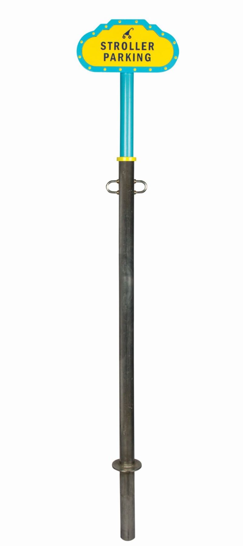 (Disneyland, c.2000s) A rare sign from Disneyland's "Finding Nemo Submarine Voyage". This sign was used to designate the stroller parking area and was created in the attraction's familiar yellow and blue color scheme. The original metal base is still attached, and the sign measures approximately 5.5ft tall. The condition is very good with minor wear from park use.