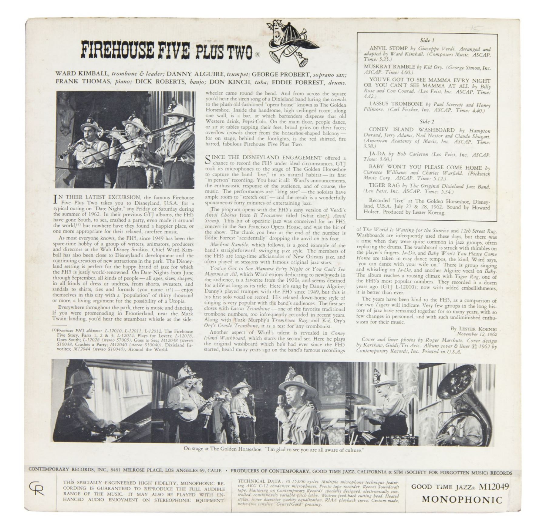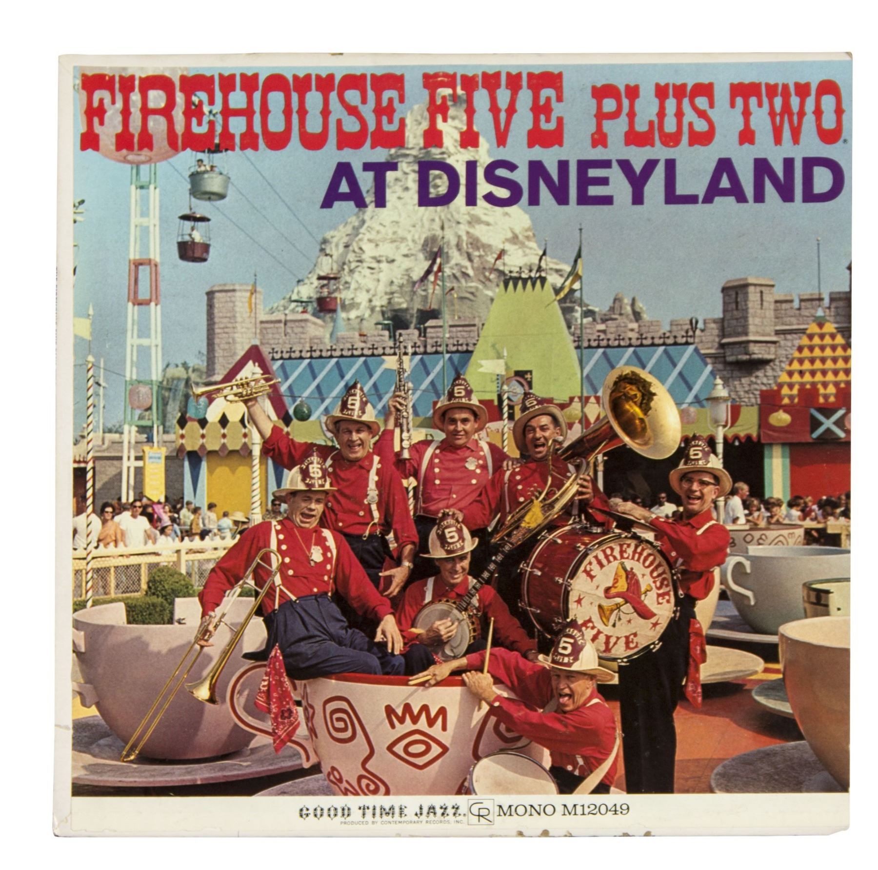 (Disneyland, 1962) A rare Firehouse Five Plus Two album recorded live at the "Golden Horseshoe" at Disneyland. The record measures 12.5"x12.5" and is in good condition with some wear, including separation along the cover's edges and minor surface scuffing to the vinyl.