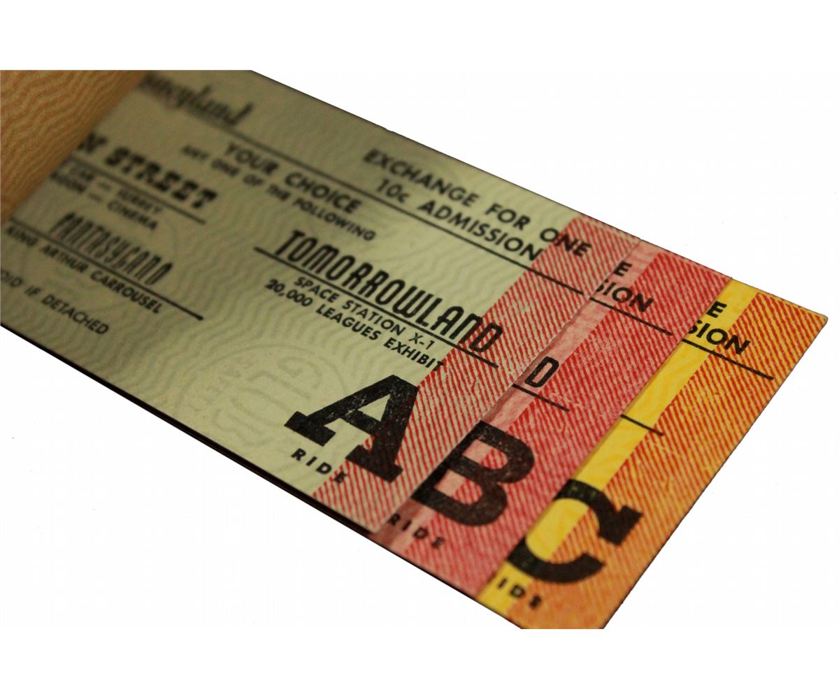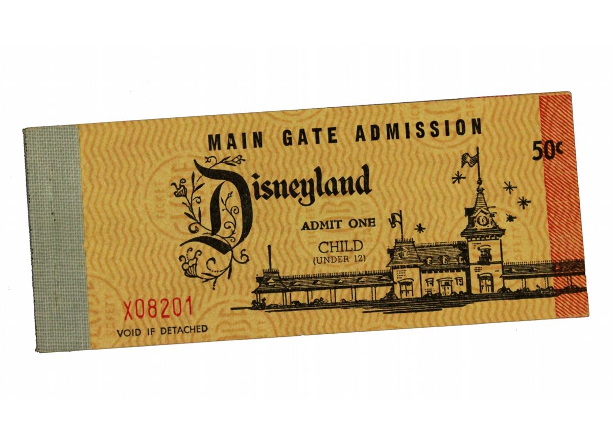 (Disneyland, 1955) An extremely rare first version of the famous, Disneyland Ticket Books available in October 1955. In answer to guest feedback following the park’s first Summer season, Disneyland created a ticket book option in the Fall of 1955. “A Day at Disneyland” ticket books were offered to provide volume discounts for multiple attraction purchases due to complaints of Disneyland’s high cost. This rare 8-Ride book in Child’s denomination is complete, featuring the gorgeous admission ticket, (3) “A” Tickets, (2) “B” Tickets, and (3) “C” Tickets. ”C”, being the 1955 equivalent of the later, “E” Ticket. Measuring 2 x 5 in. In very good condition.