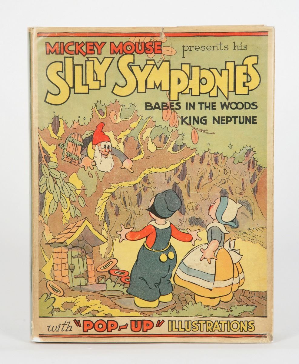 (Blue Ribbon Books, 1933) Rare first edition "Mickey Mouse Presents His Silly Symphonies" pop-up book containing (2) Silly Symphony stories and (4) fine full-color pictorial pop-ups. Printed on card stock with its original dust jacket. Measures 9.75"x7.75"x1". 48 pages. In fine condition with mild wear to the dust jacket edges including a small 0.4" tear along the top edge, and expected aging and light discoloration to the book. A few small hand-written notes in pencil on inside cover. Comes with a later London-printed version of the same book.