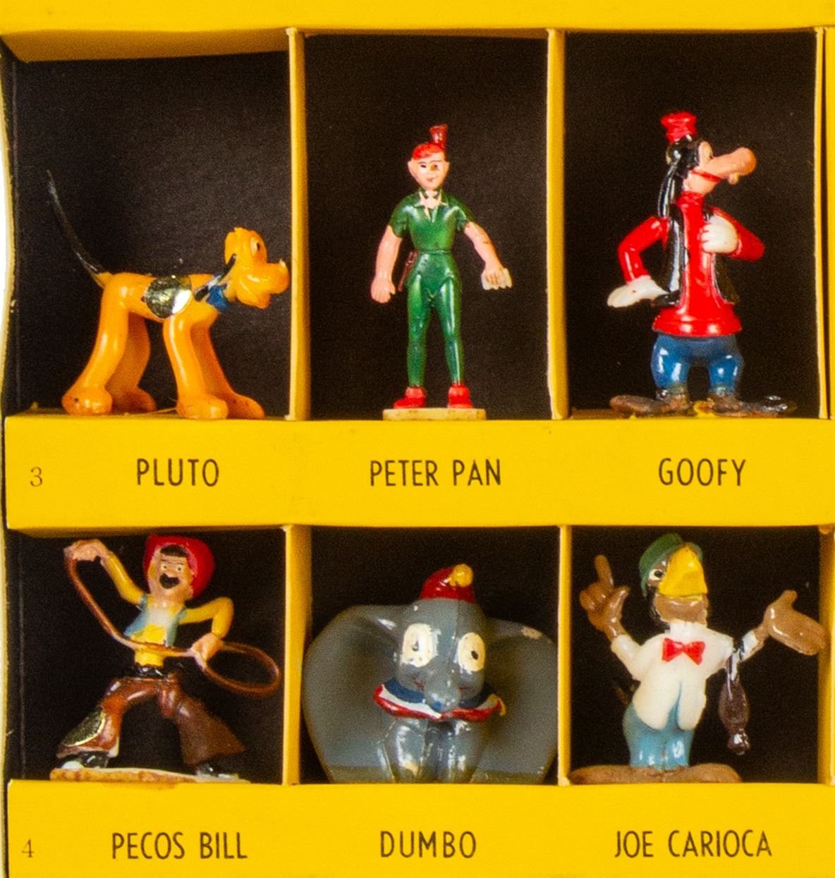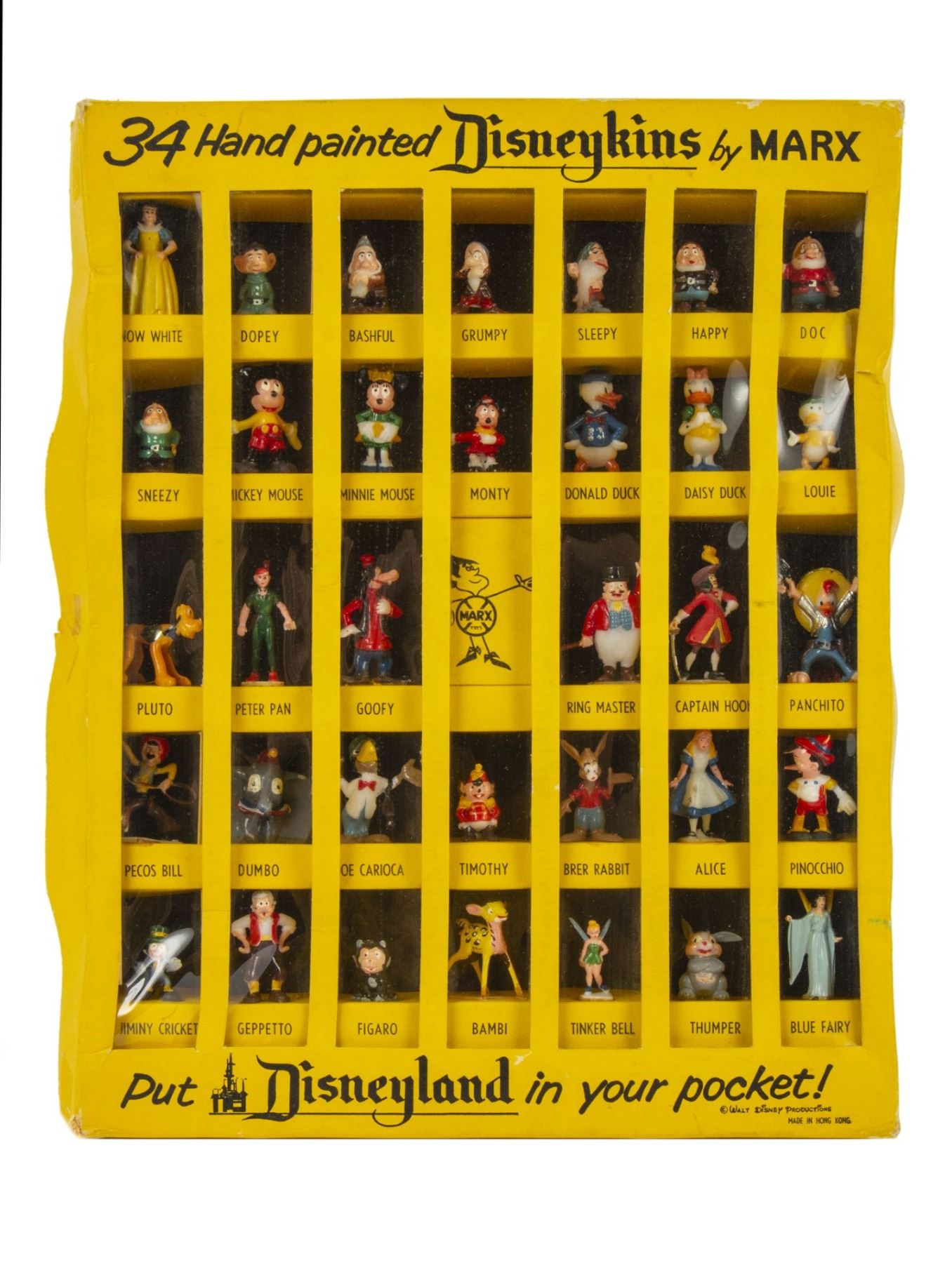 (Marx, 1961) This first series gift box by Marx contains the entire set of (34) hand-painted figures and comes in its iconic yellow cardboard box with view-holes for each figure. The box measures 12.5"x10" and is in very good condition with some creases and spots of discoloration to areas of the cardboard box. A few of the figures appear to have been re-adhered in place.