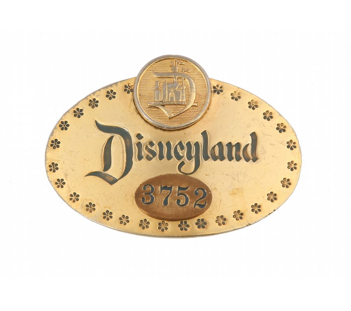 (Disneyland, 1955) Extremely rare original Disneyland brass ID badge from 1955. Before the well-known Disneyland cast-member name tags were issued, Disneyland supplied these brass employee ID number badges to all cast-members. Walt Disney himself carried one of these with the ID # 1. Measuring 1.75”x2.5” and in very good condition with paint wear and fading from use.