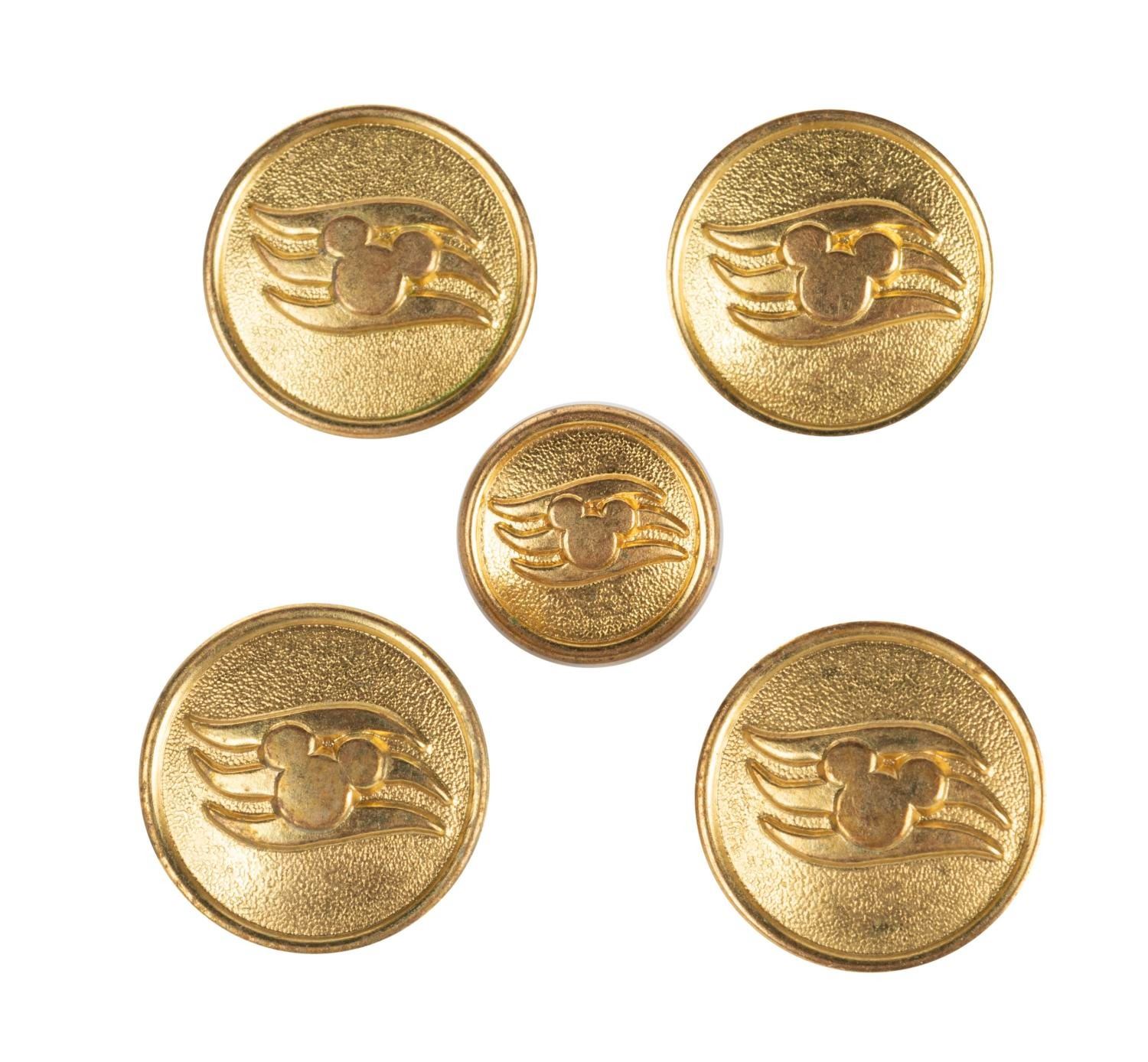 (Disney Cruise Lines, 1990s) Five buttons from Disney Cruise Line Cast and Crew Member uniforms. Measuring from .5” to .75”, the buttons are in very good overall condition.
