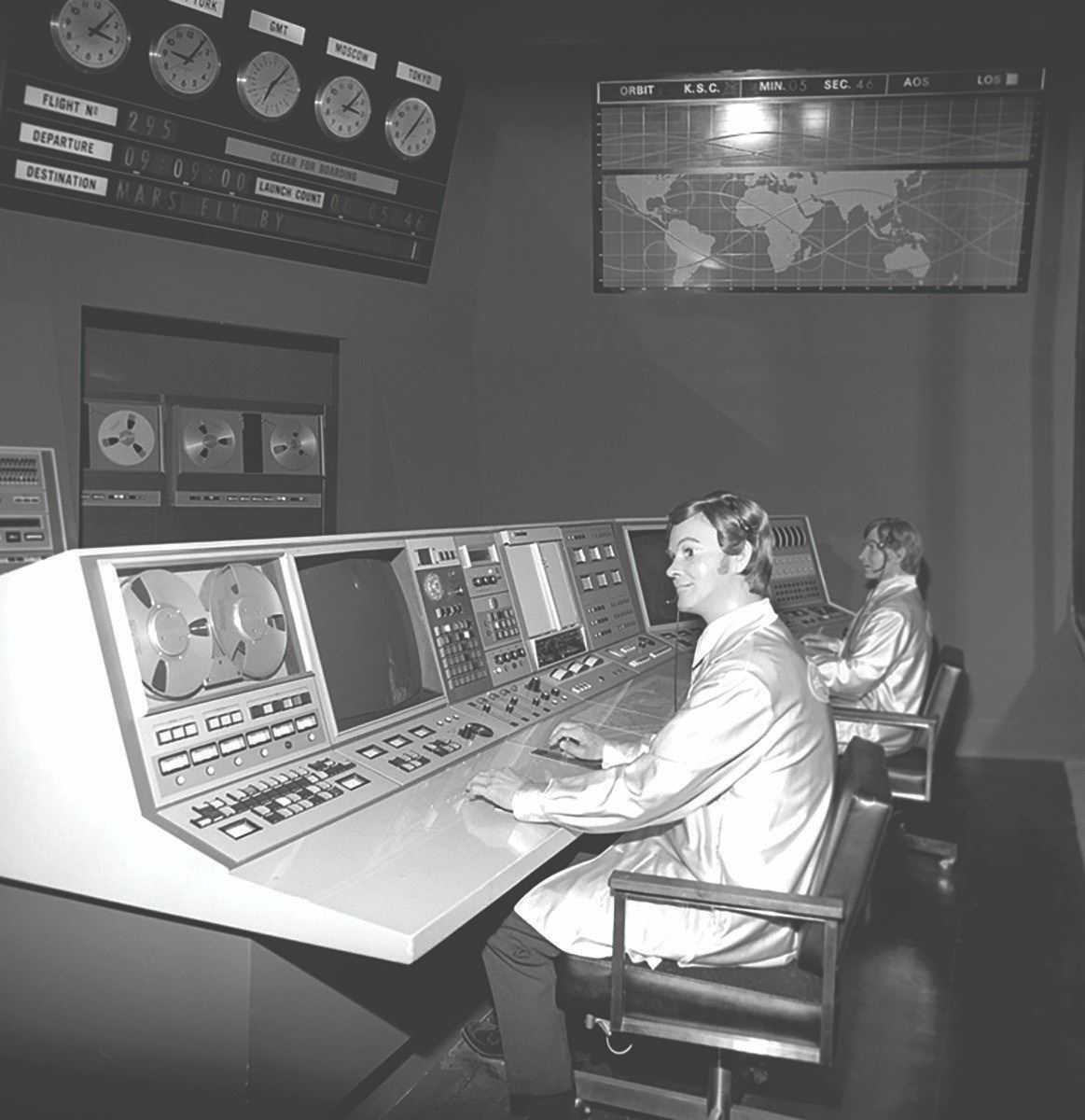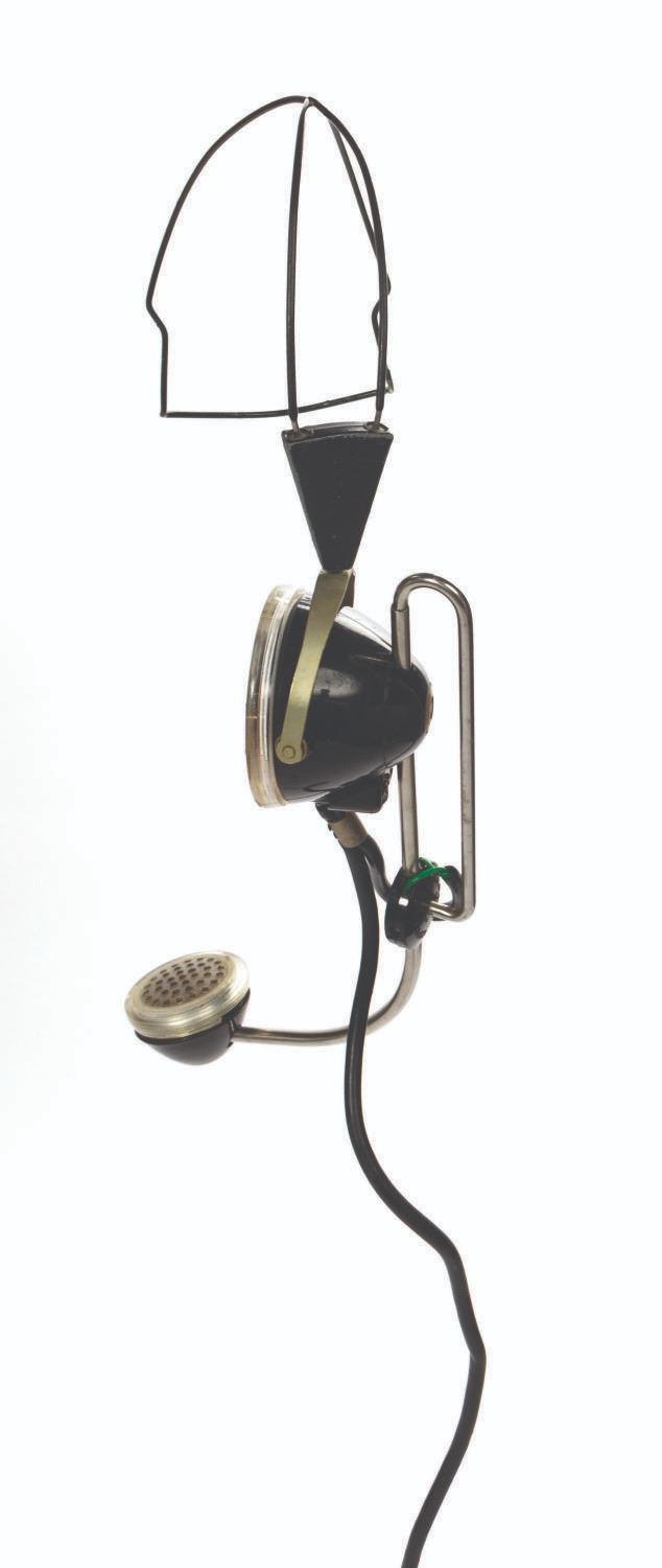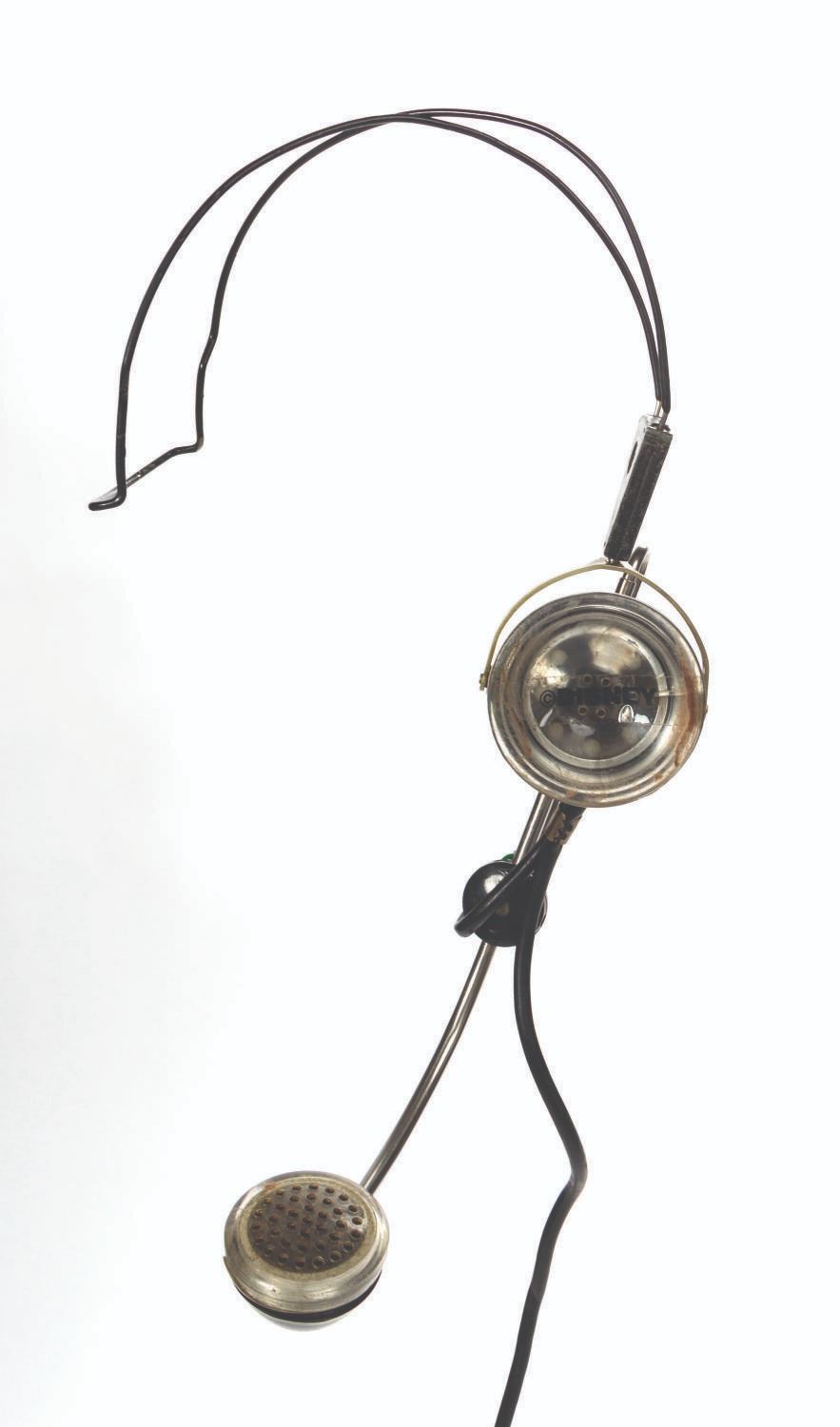 (Disneyland, c.1970s-1992) An original prop headset worn by an animatronic figure in Mission Control within Disneyland's Flight to the Moon attraction. The attraction was refurbished in 1967 as Flight to the Moon from its original opening day name of Rocket to the Moon, and was later updated again in 1975 as Mission to Mars. This prop is believed to have been used in both the Flight to the Moon and Mission to Mars versions of the attraction. After the attraction's closure in 1992, Disney offered this prop at the Official Disneyana Convention. The original convention label for this prop is included. The headset measures approximately 11"x7", not including the additional length of cut cord. The condition is good, with a trimmed end of electrical cord from the prop's removal, and some small chips to the cap on the mouth speaker.