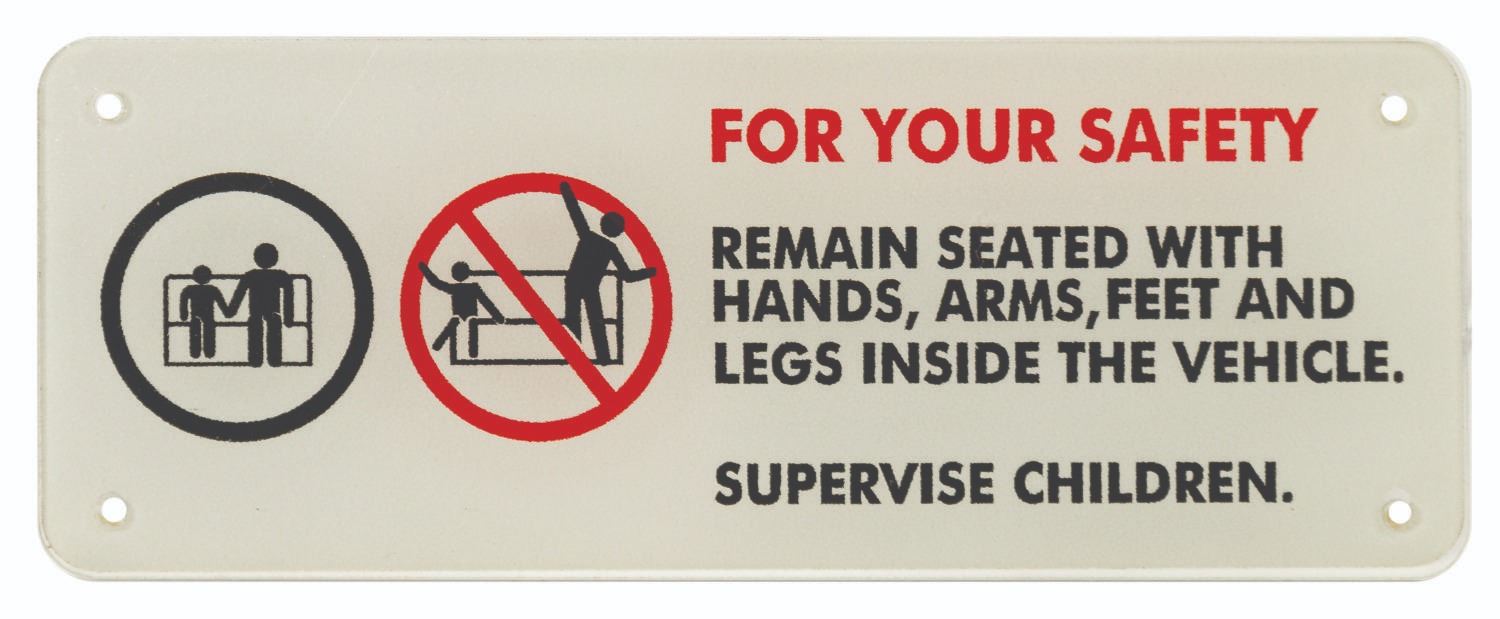 (Disneyland, c.2000s) A Disneyland attraction vehicle safety sign. The printed sign is adhered to acrylic board and reads "For Your Safety" and instructs guests to keep all body parts inside the vehicle and to supervise children, with imagery denoting the proper and improper ways to sit. Measuring 2.5"x6.75", the sign is in very good condition with minor surface wear.