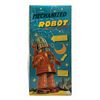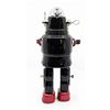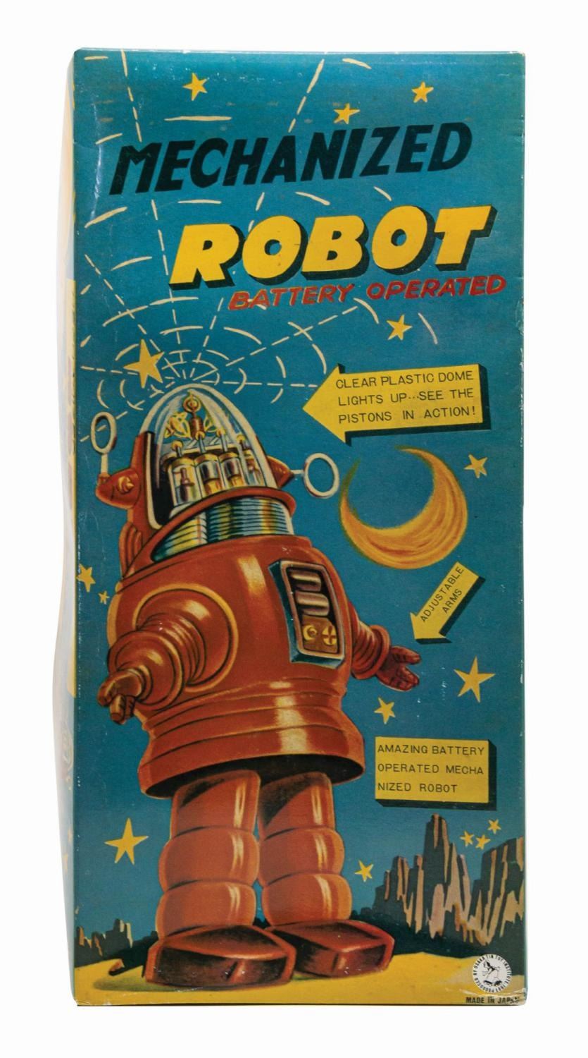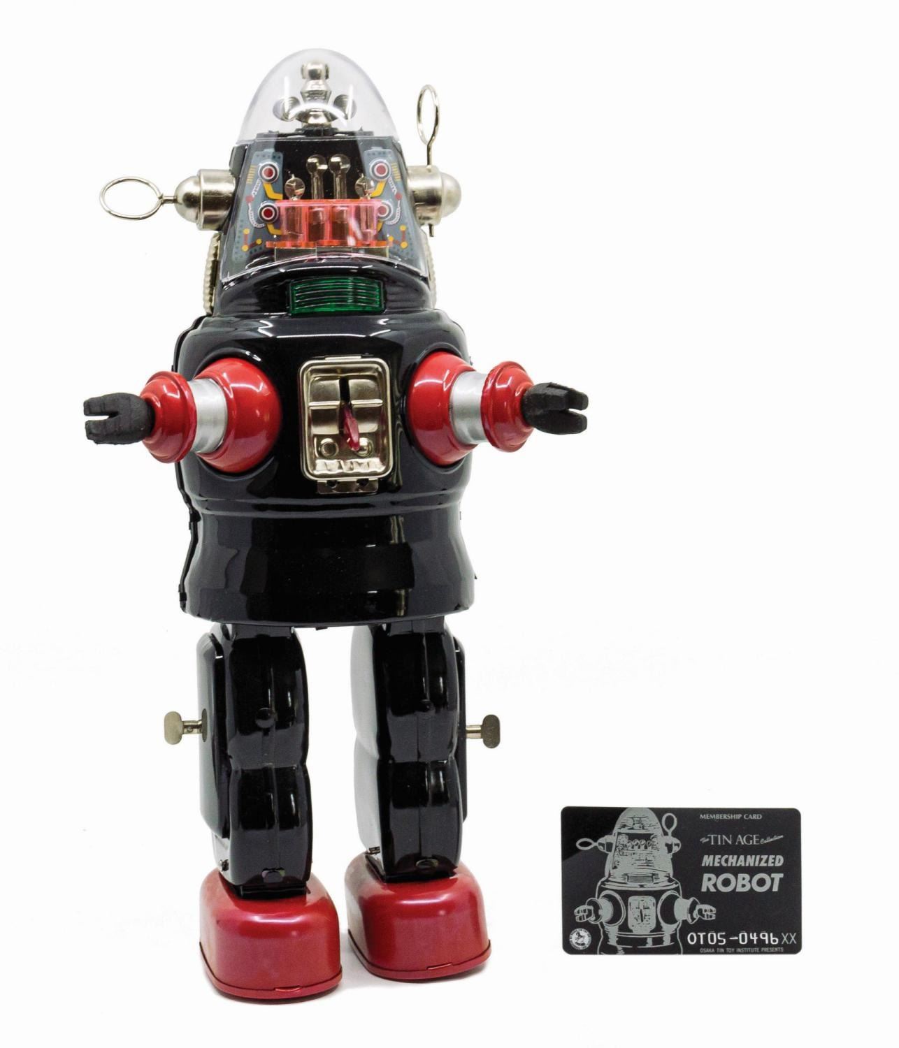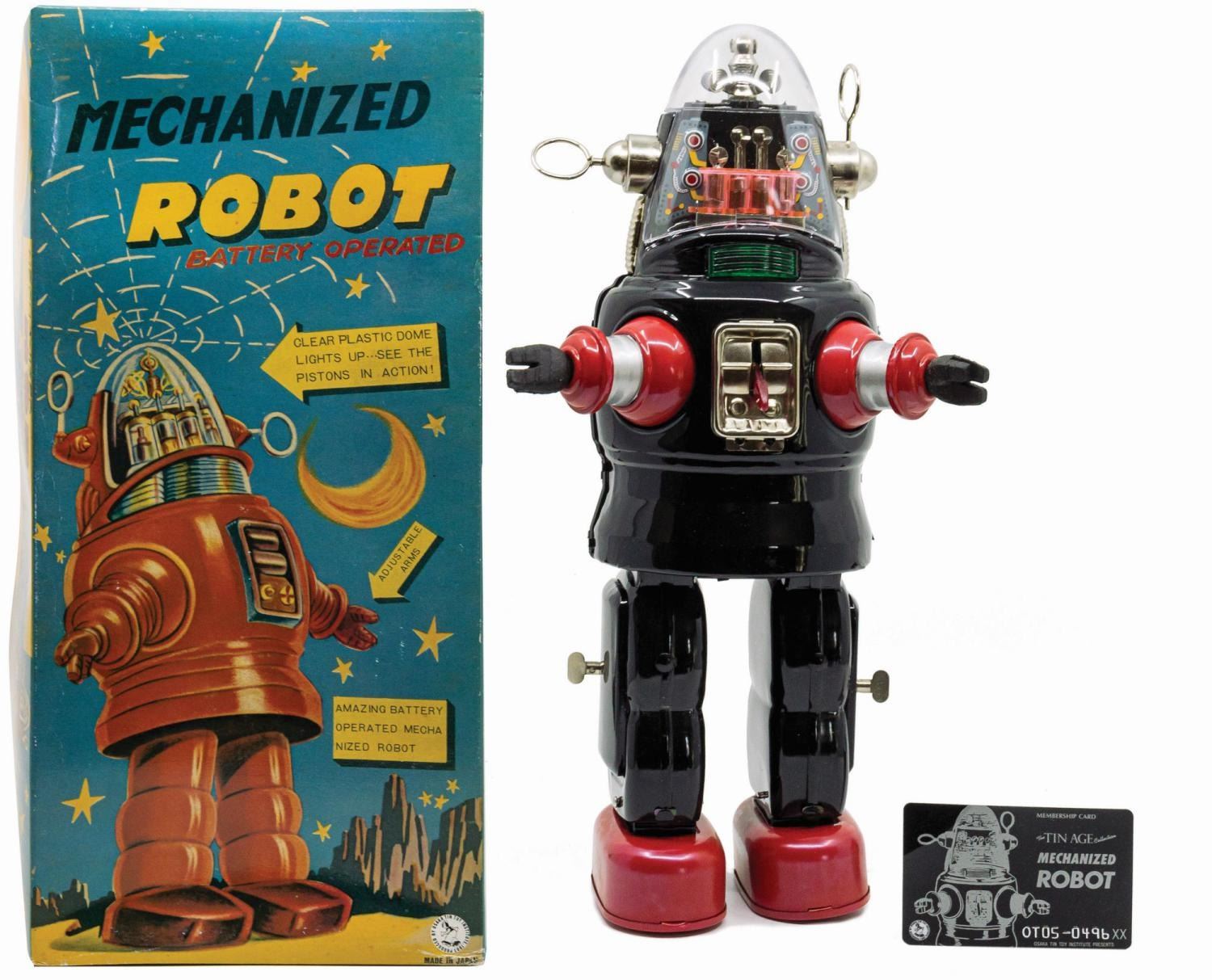 (Osaka Tin Toy, 1991) A battery operated Mechanized Robot tin toy inspired by Robby the Robot from Forbidden Planet. When activated, the robot becomes a flurry of activity. Colored lights illuminate and pistons pump in the head cavity, metal antennae spin, and the legs roll back and forth, which slowly propels the robot forward. The electronics are in good working order. A Tin Age Collection credit card-style cert numbered "OT05-0496" and the original box are included. Measuring 13" tall, the robot is in fine condition with only minor paint wear to the reverse. The box has some wear around the edges of the lid, light spidering, and spot surface loss.