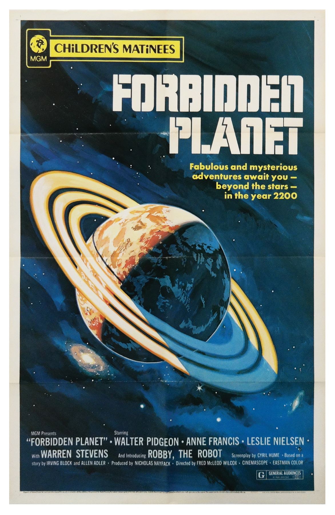 (MGM, 1972) A scarce one sheet poster for the science fiction classic Forbidden Planet, starring Robby the Robot. This poster was used to promote MGM Children's Matinees, a series of screenings between 1970 and 1972 that attempted to draw in younger audiences through new trailers and targeted advertising. The results were rare specialty posters such as this. Measuring 41"x27", the poster is in good condition overall with some wear along the original fold lines, including a few very small tears at the intersection points of the fold lines.