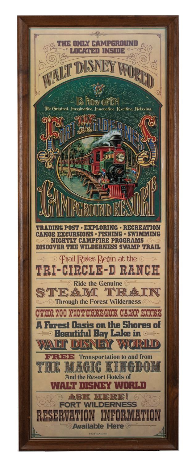 (Walt Disney World, 1971) A framed attraction poster for the opening of the Fort Wilderness Campground Resort at Walt Disney World. Inspired by 19th century railroad advertisements, the poster promotes other attractions like the Wilderness Swamp Trail, canoe excursions, and the Fort Wilderness Railroad as envisioned by Walt Disney Imagineer Bob McDonnell. The print has an image size of 15.25"x45.5" within a 17.75"x48" wooden frame. The piece is in very good condition, despite some tearing to the original paper dust cover on the reverse, but retaining the portion bearing the official label of Retlaw Enterprises.
