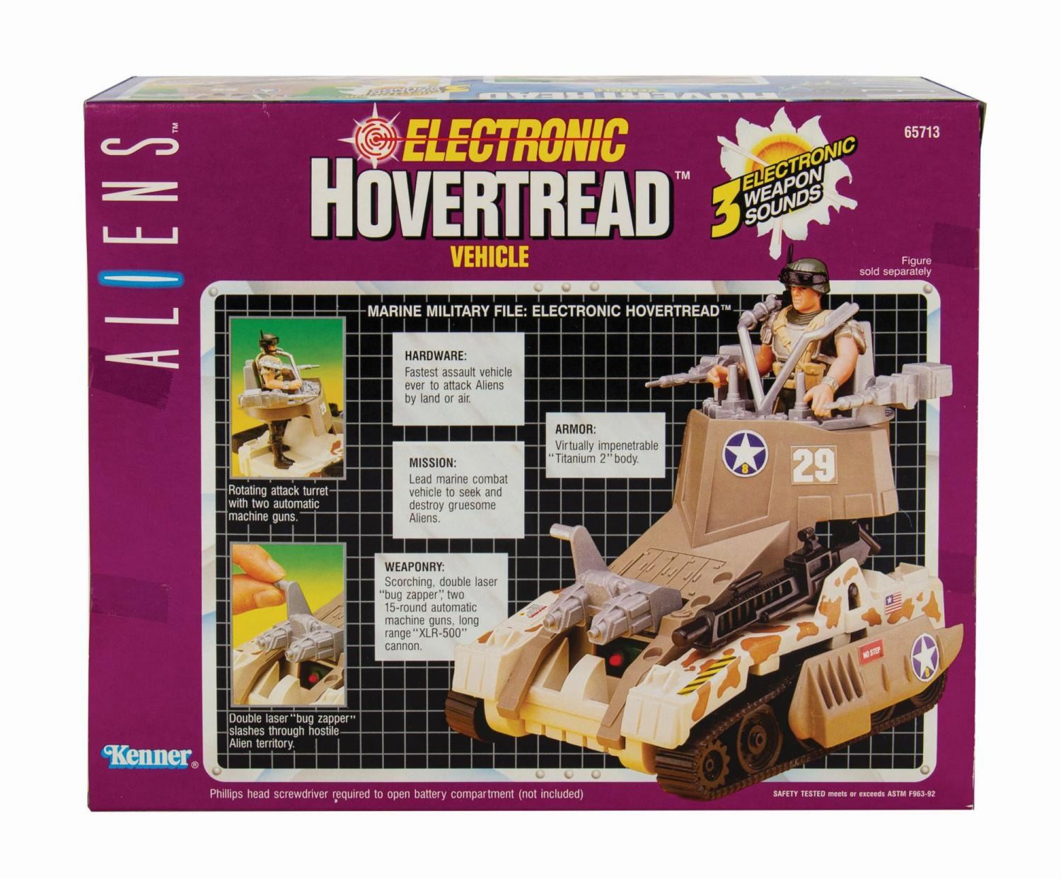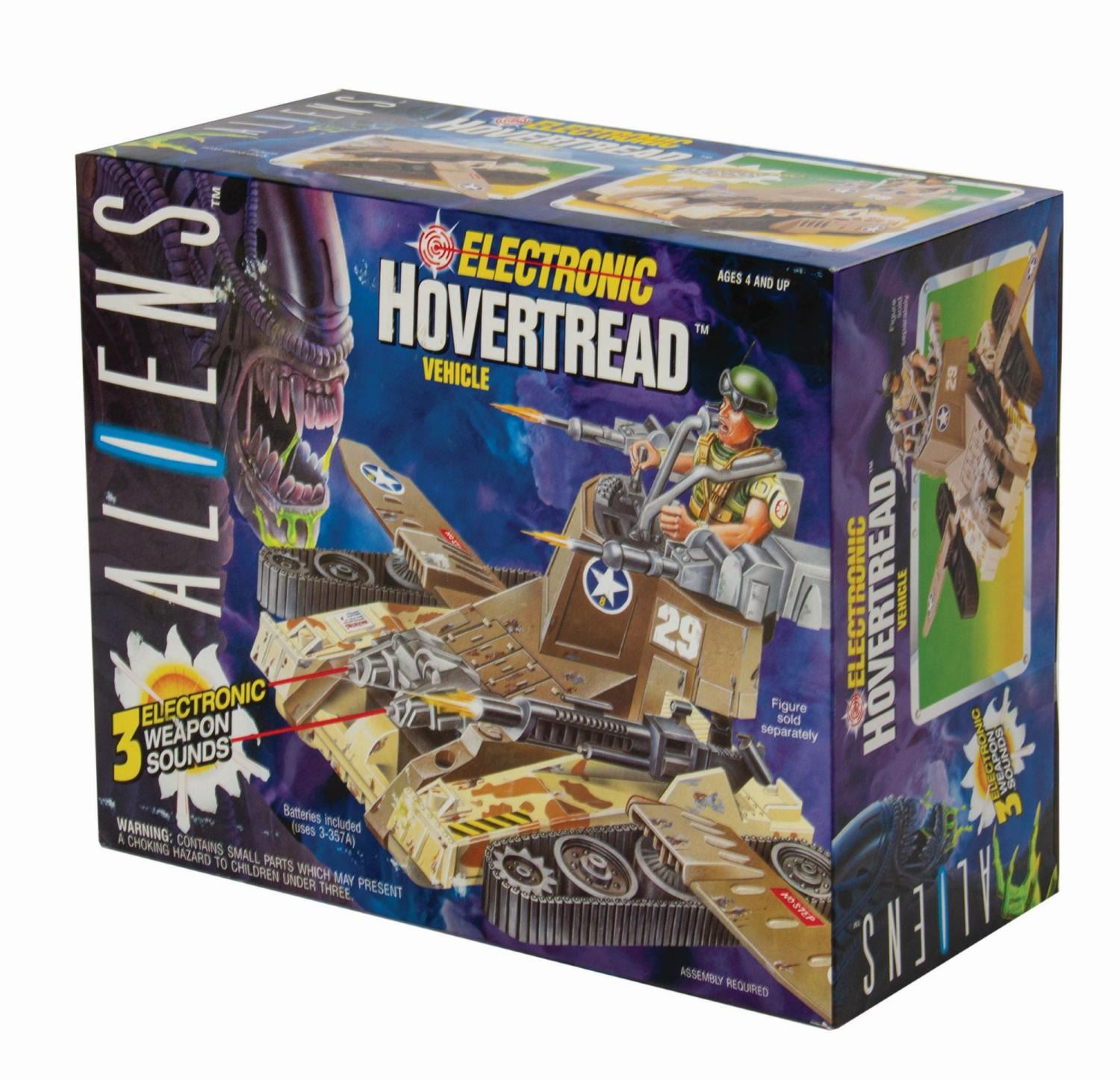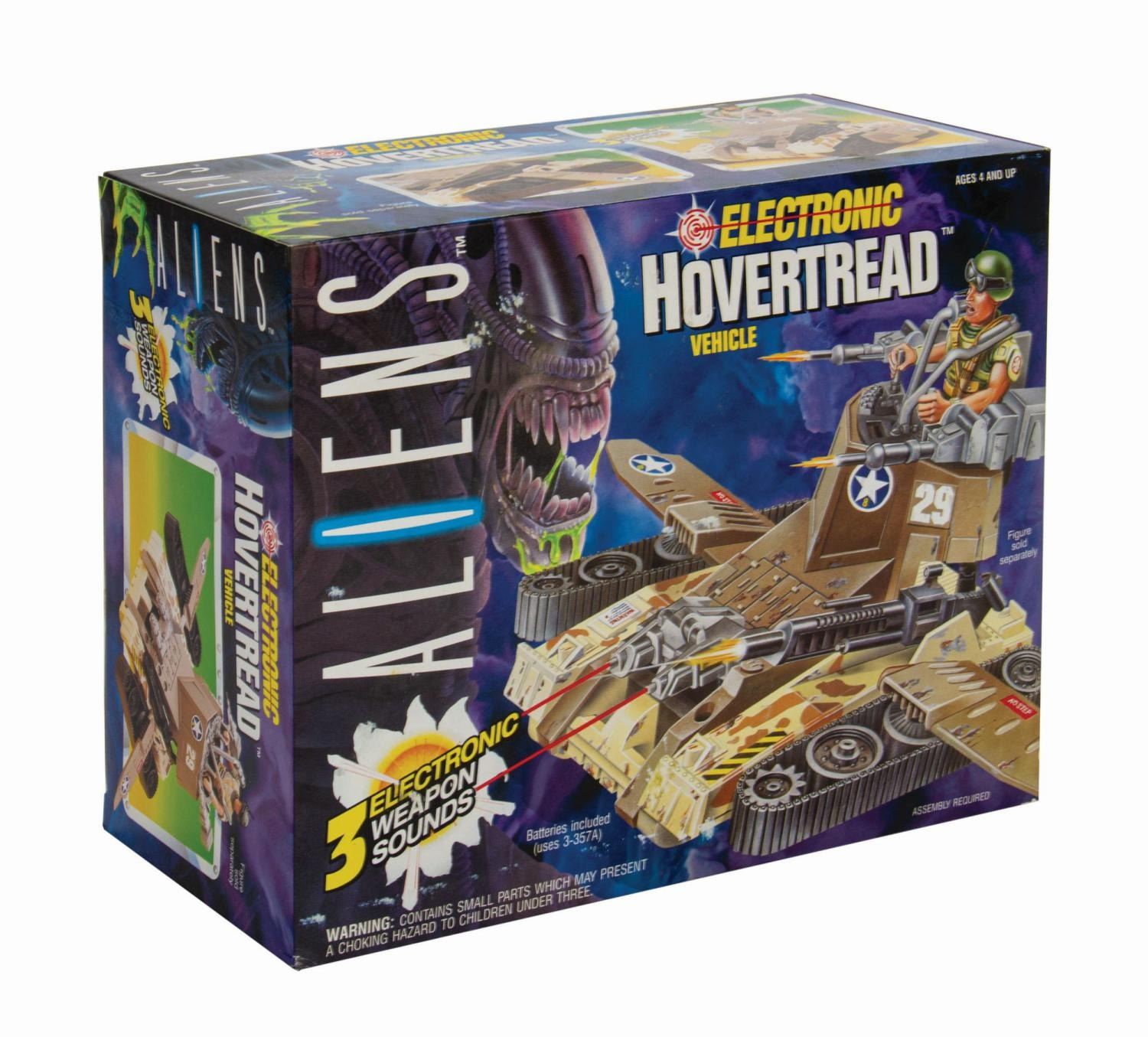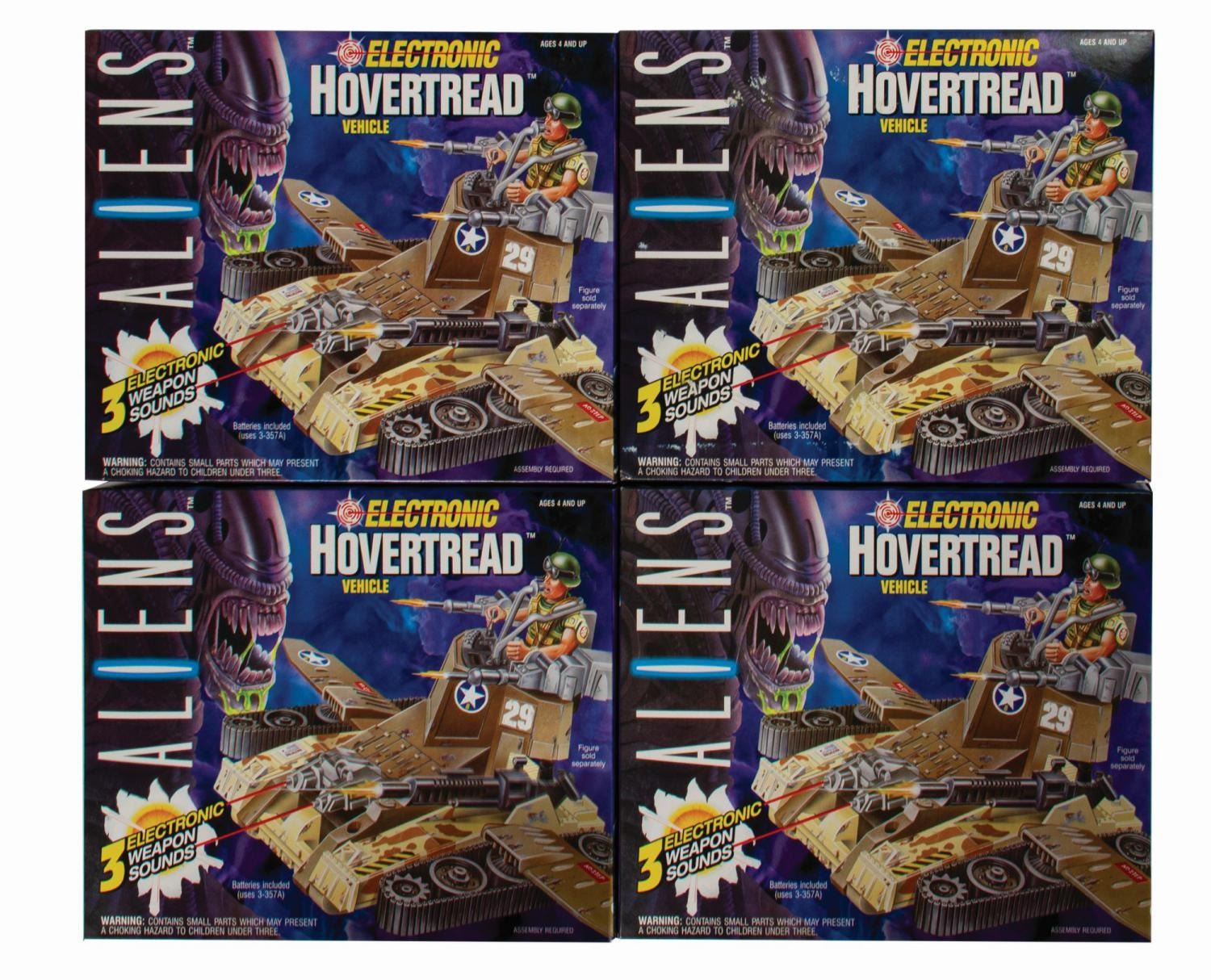 (Kenner, 1992) Four Electronic Hovertread vehicles from Series 2 of the Aliens action figure line, factory sealed with tape in the original packaging and assembled in the original factory case. The vehicles feature rotating attack turrets and play electronic weapon sounds. The Hovertread vehicle packaging measures 8" x 10" and 4.75" deep. The case is 11" x 14.5" and 16.5" deep. The unopened boxes are in fine condition or better, with some exhibiting minor surface wear. The vehicles themselves are as-new. The case exhibits wear from shipment.