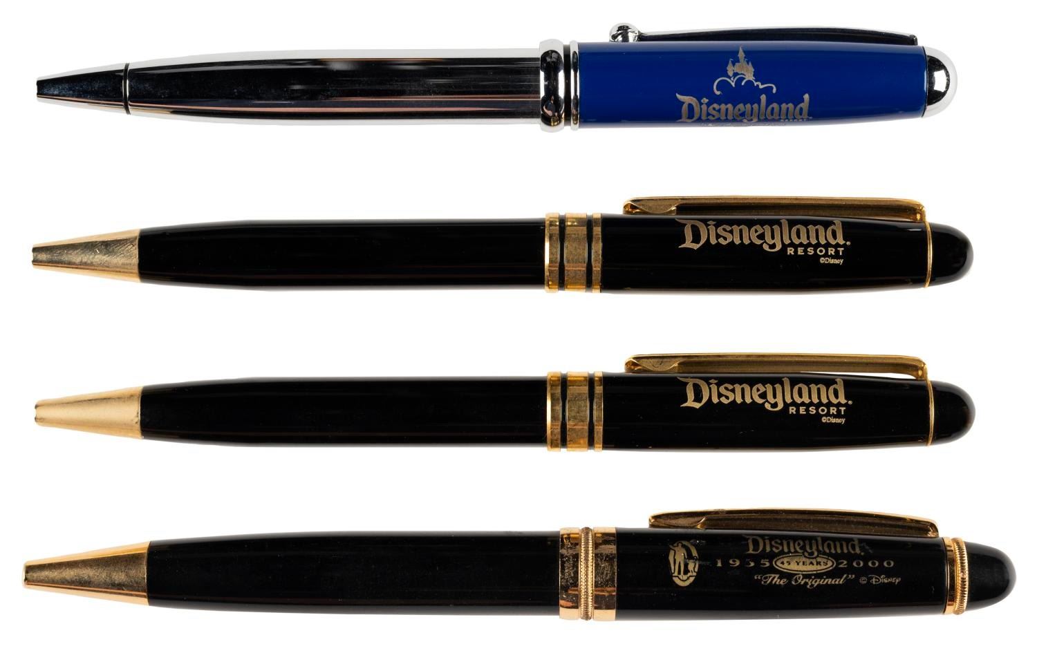 (Disneyland, 1990s-2000s) A collection of four souvenir ballpoint pens from Disneyland. Ranging in size from 5.25” to 5.5” long, the pens are in good condition with scratches and wear, requiring new ink cartridges to function properly.