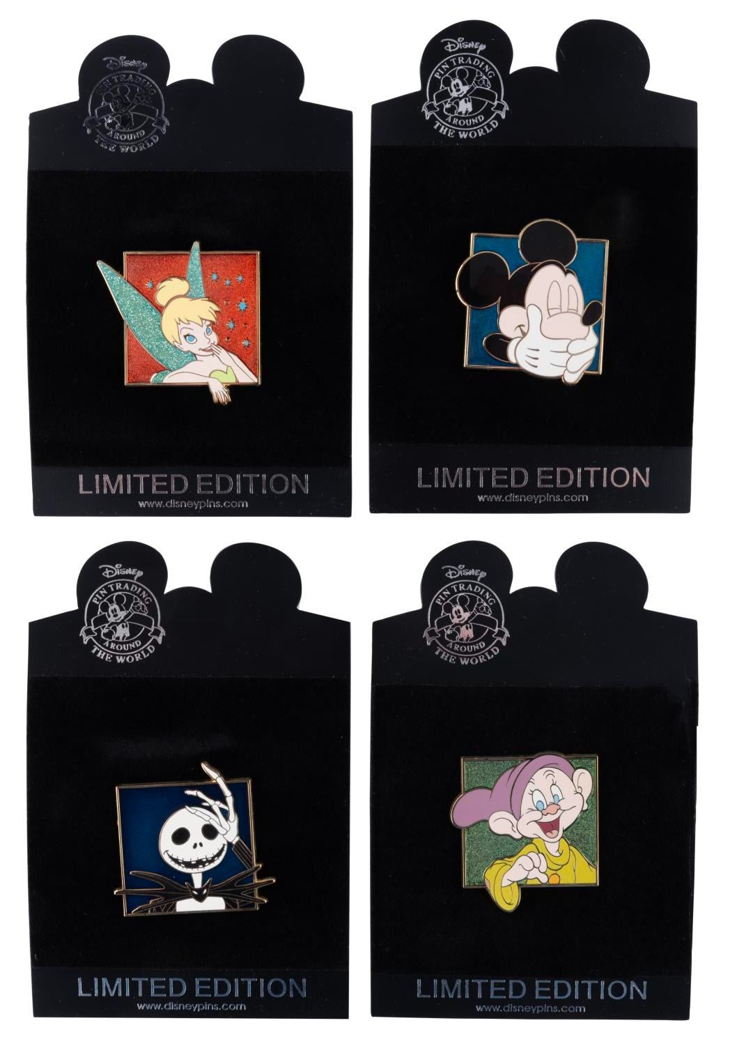 (Disney, 2010) A collection of four Pin Trading Around The World Character Portrait Pins featuring Dopey, Tinker Bell, Mickey Mouse, and Jack Skellington. Each pin was released in an edition of 250 pieces. The pins are in very good unused condition and come on their original cards.