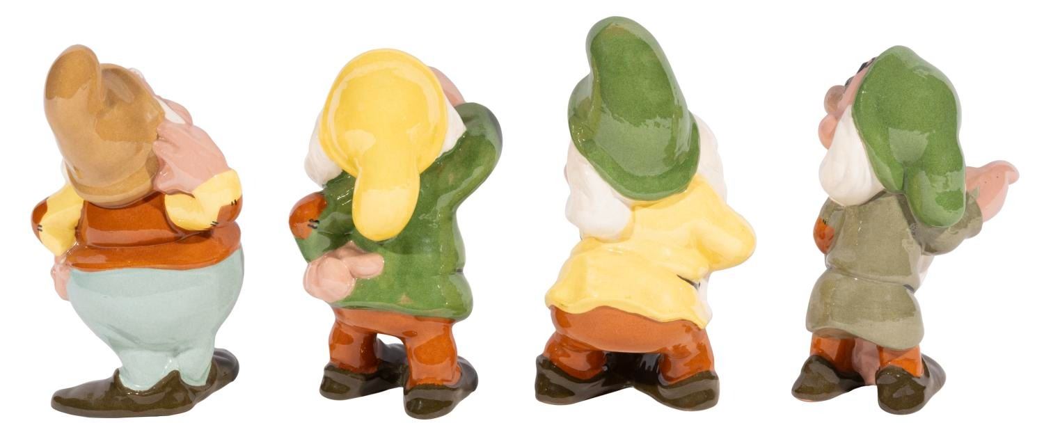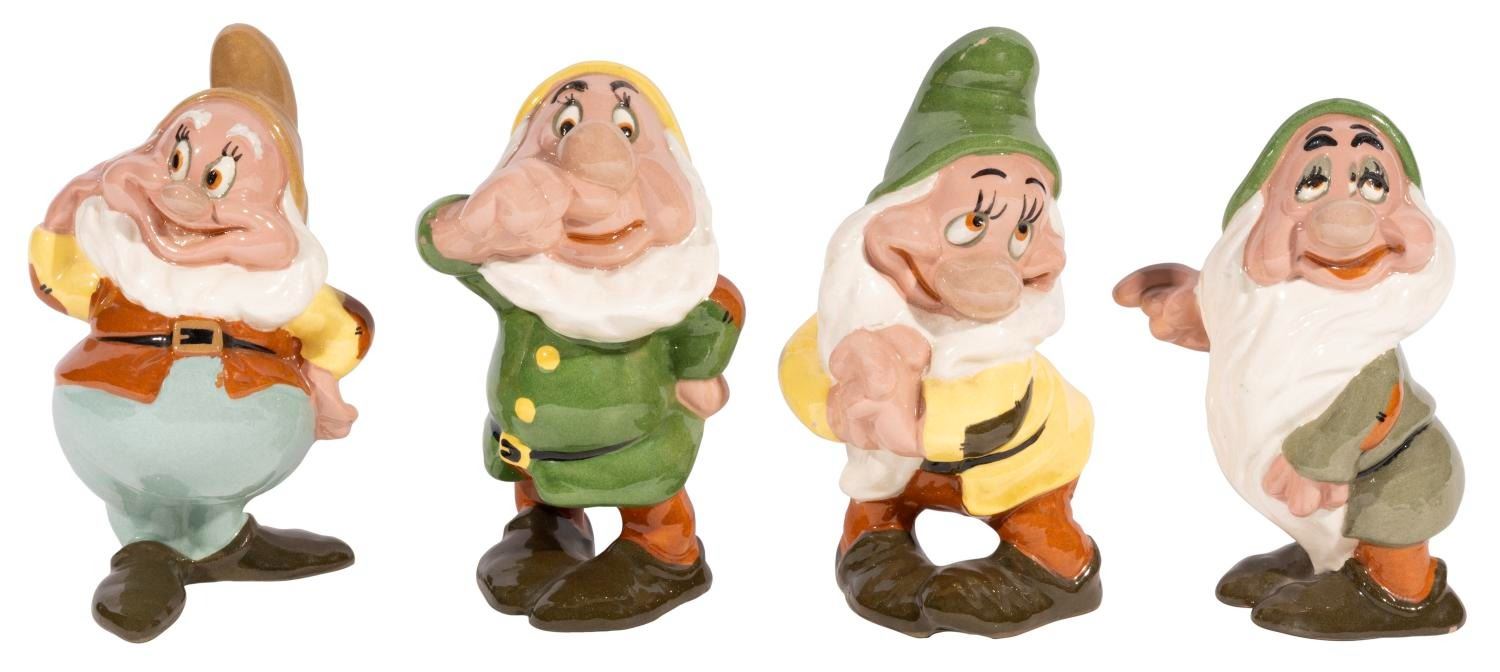 (Shaw, 1946) Four “Snow White and the Seven Dwarfs” ceramic figurines manufactured by Evan K. Shaw including Sneezy, Bashful, Happy, and Sleepy. Shaw and his companies, also known as American Pottery and Metlox, produced pottery and many ceramic figurines for the Walt Disney Studio throughout the 1940s and 1950s. Measuring 7.5" tall and 3.5" wide, each figure is in very good condition with production imperfections in the glaze, crazing, and light wear from age.