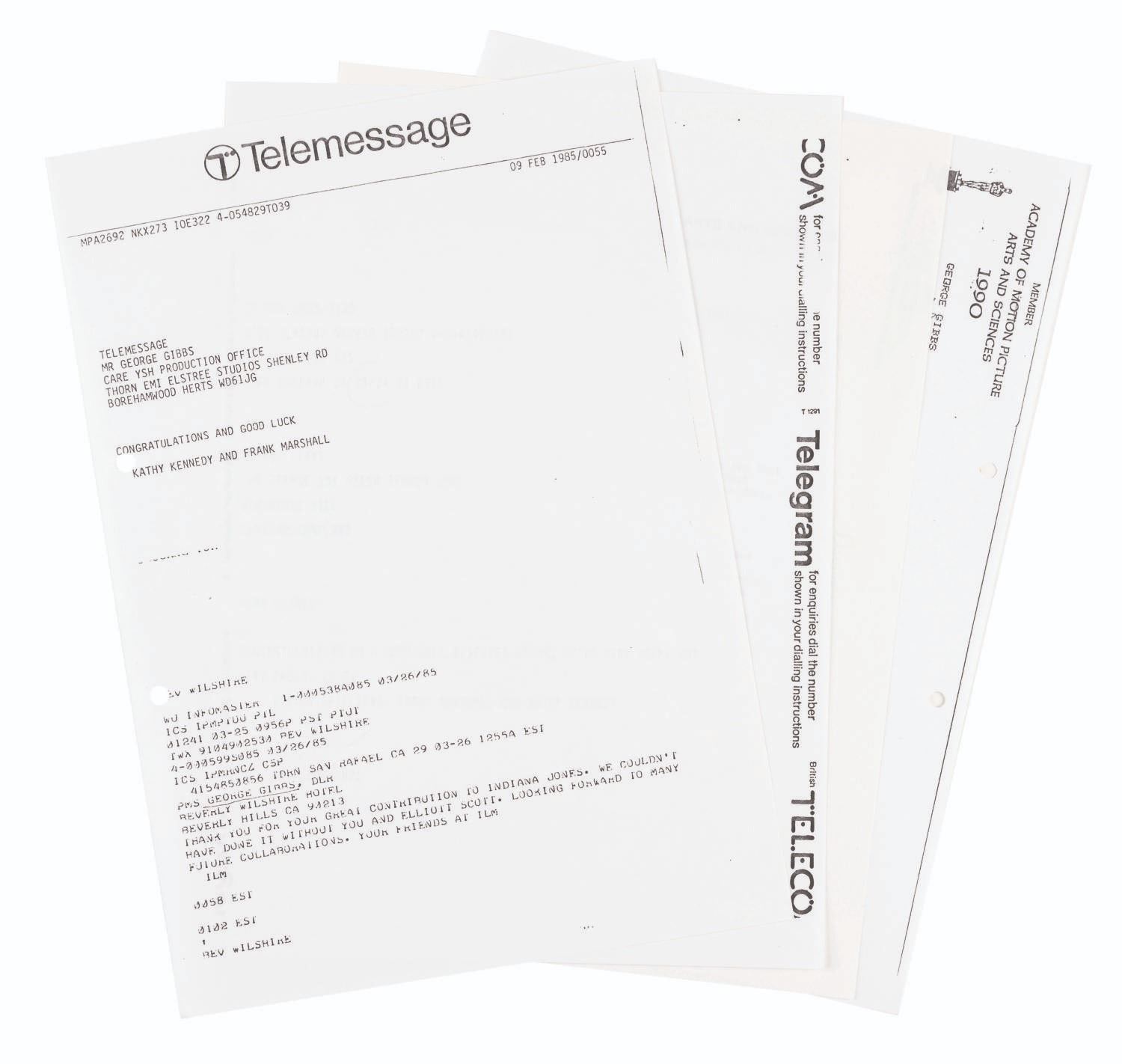 (Gibbs, 1984/90) George Gibbs's four page photocopied portfolio related to his special effects work on "Indiana Jones and the Temple of Doom.” Included are a letter of notification for an Oscar nomination for Best Visual Effects, two congratulatory telegrams from Steven Spielberg, Kathleen Kennedy, and Frank Marshall, and a copy of a membership card and certificate to the Academy of Motion Picture Arts and Sciences. Measuring 8.5” x 11”, the pages are in fine condition.