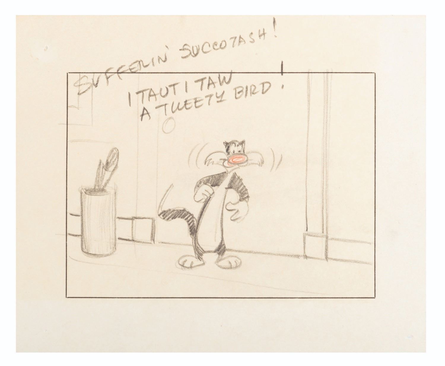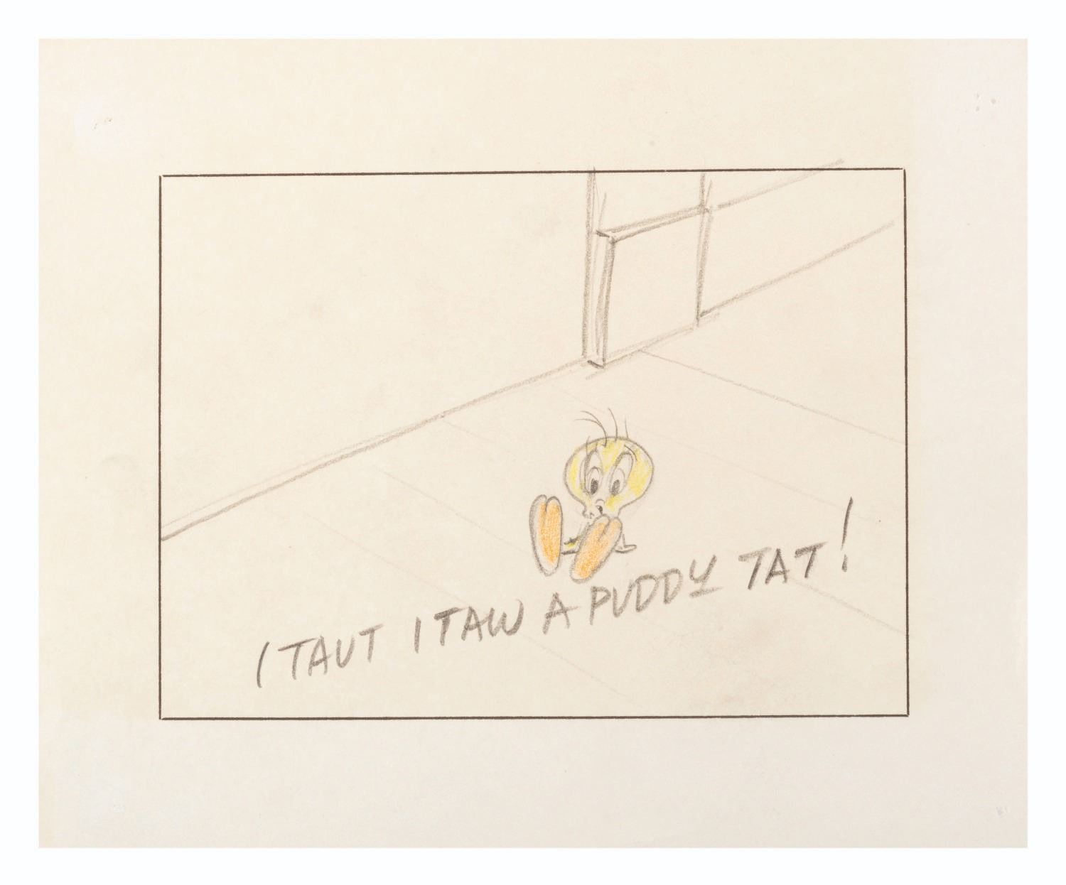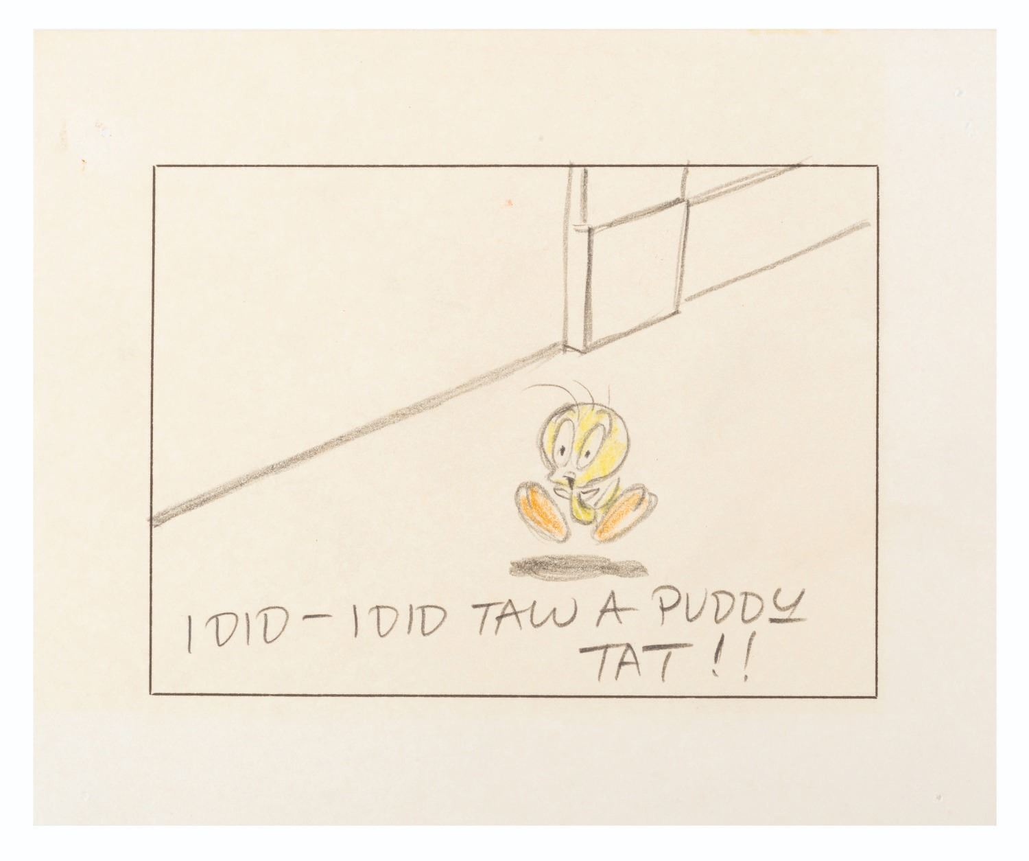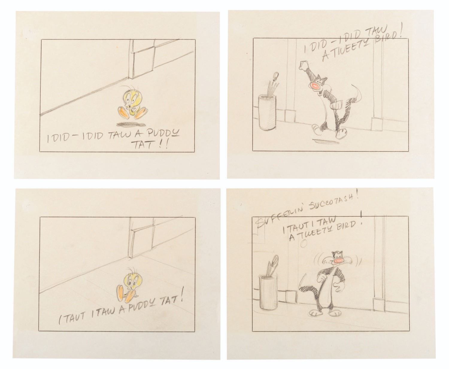 (Warner Bros., 1953) Four storyboard panels from the Looney Tunes short “A Street Cat Named Sylvester.” Accomplished in graphite and colored pencil and measuring 5.75” x 7” each, the panels are in very good condition with light edge wear and pinholes from production use and light discoloration from age.
