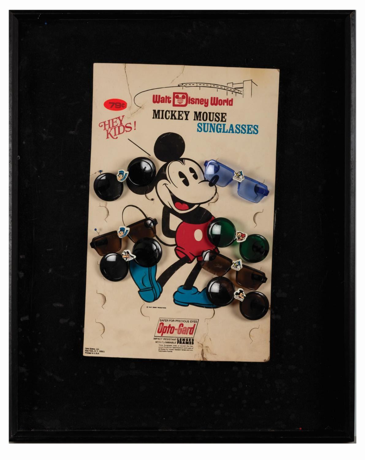 (Walt Disney World, c.1980s) A Walt Disney World Mickey Mouse sunglasses cardboard display featuring various styles of mounted Opto Specs brand Opto-Gard sunglasses. Included are (2) Donald Duck, (2) Jiminy Cricket, (1) Dopey, (1) Goofy, and (1) Mickey Mouse sunglass samples. The WDW Mickey Kids Sunglasses Display measures 21"x13.25" in a 30.75"x24.75" shadow box. The display carrying the original 79 cent price sticker is in good condition, exhibiting minor creases and wear from Park use. The glasses are mostly in fine condition with minor extremely creasing to the Characters of (2) pairs.