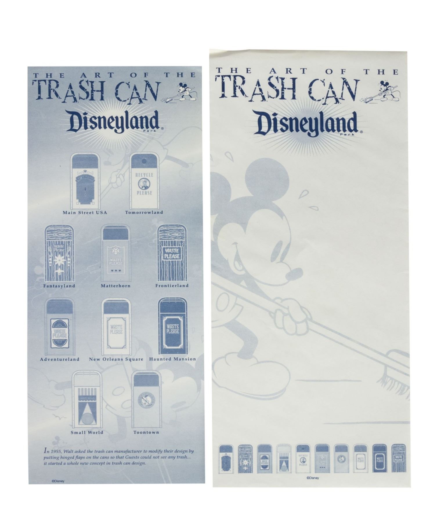 (Disneyland, 2001) A very rare set of (10) pins featuring the decorative trash cans seen throughout Disneyland. Famously, in 1955, Walt Disney did not like the idea that guests were able to see the refuse in the trash cans within his park. Walt asked if the trash cans could be built with hinged flaps that would hide the trash from sight, and an entirely new concept in trash can design was created. Each of these pins represents a different land or attraction, such as "Fantasyland", "Haunted Mansion", "Small World", "ToonTown", and more. Framed with the 10 trash can pins are a Sleeping Beauty Castle pin, a Main Street mailbox pin, an admission ticket pin, and a "Keep it Clean" pin. The framed set measures 9"x11" and is in very good condition with little wear. Included with the pins is a card that describes what land or attraction each pin is from, and an envelope for the card.