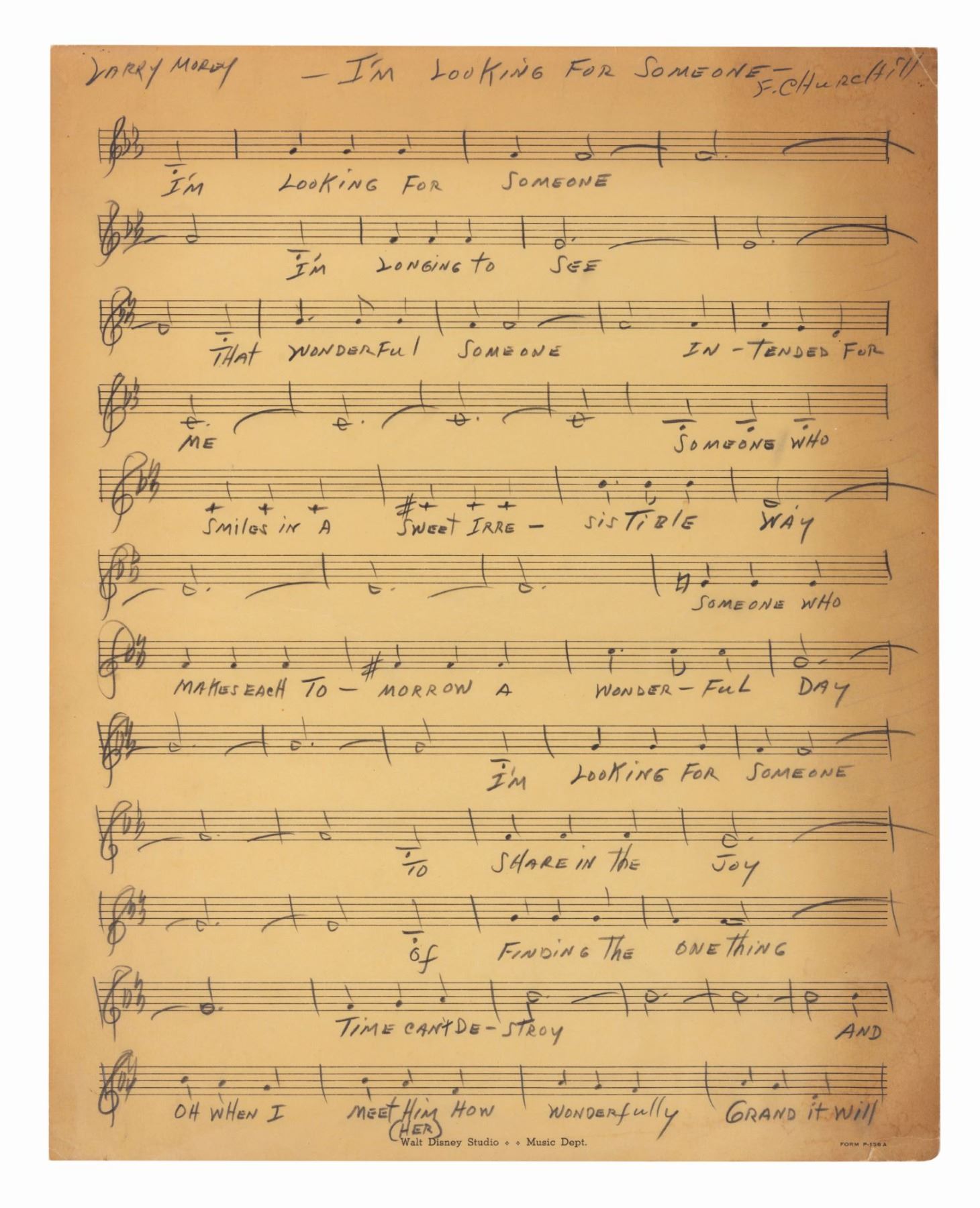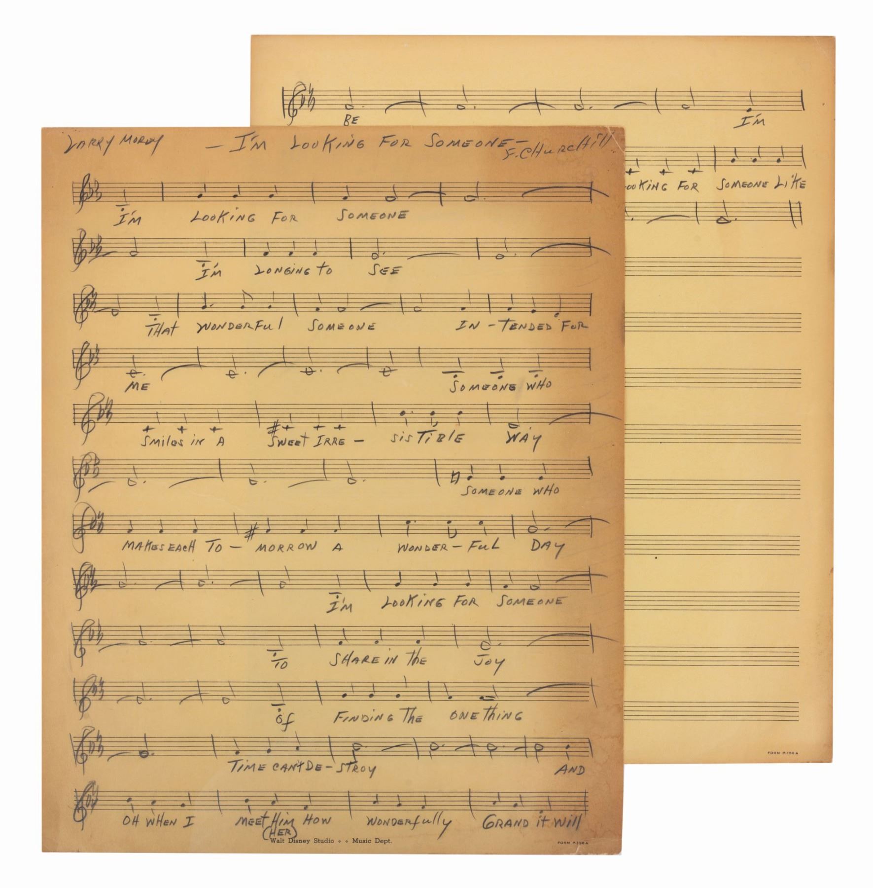 (Disney, 1939-42) Extremely rare hand-written music for "I'm Looking For Someone" by Frank Churchill and Larry Morey. This developmental piece was arranged for the production of Walt Disney's "Bambi," but was ultimately cut from the final version of the film. The music is signed by Churchill at the upper right and is written in his hand. Measuring 11.25"x14", each page is in very good condition with expected yellowing and wear to the surfaces, edges, and corners.