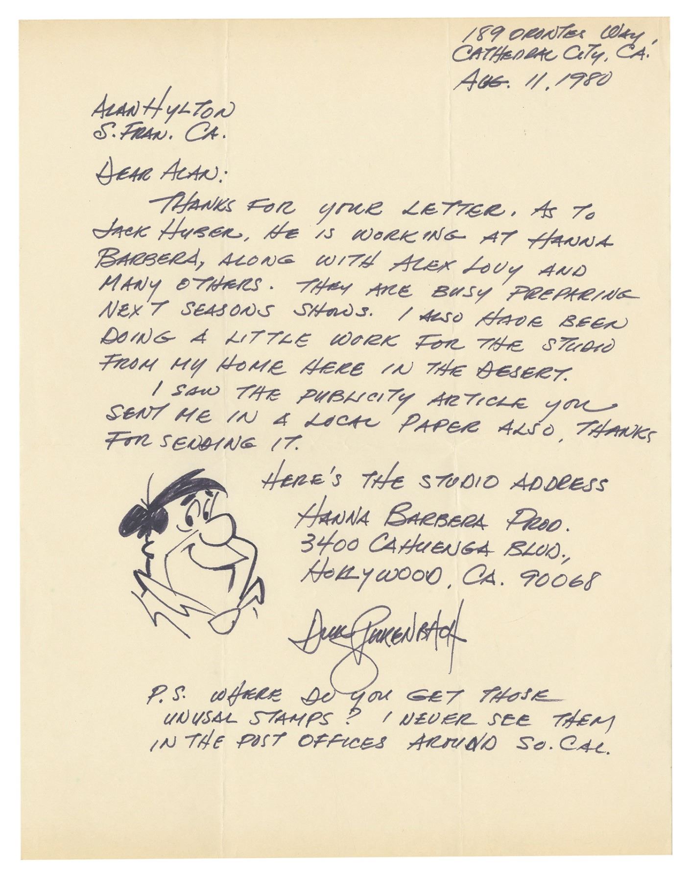 (Hanna-Barbera, 1980) A hand-written letter and original drawing of Fred Flintstone by Dick Bickenbach. Known as an animator and comic book artist for many cartoon characters including Fred Flintstone, Bickenbach wrote this letter in response to a fan letter from Alan Hylton. Measuring 11"x8.5", the letter is in very good condition with minor wear and creasing from being folded.