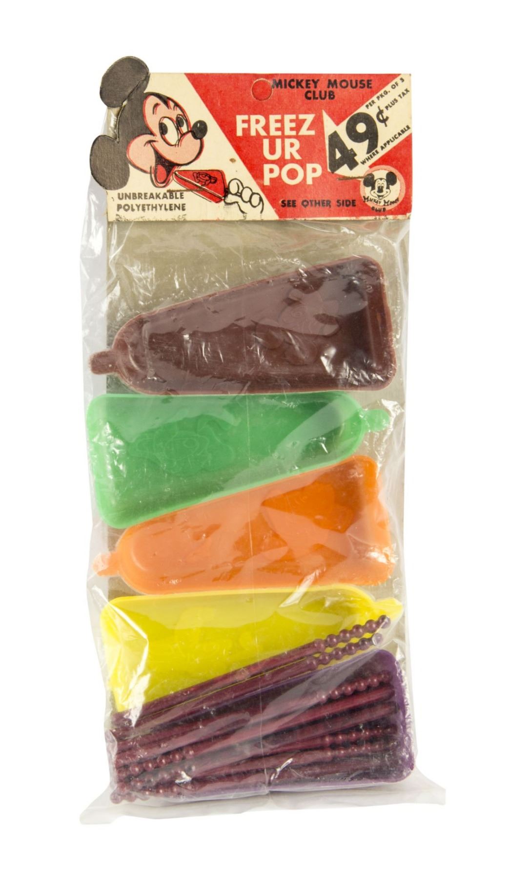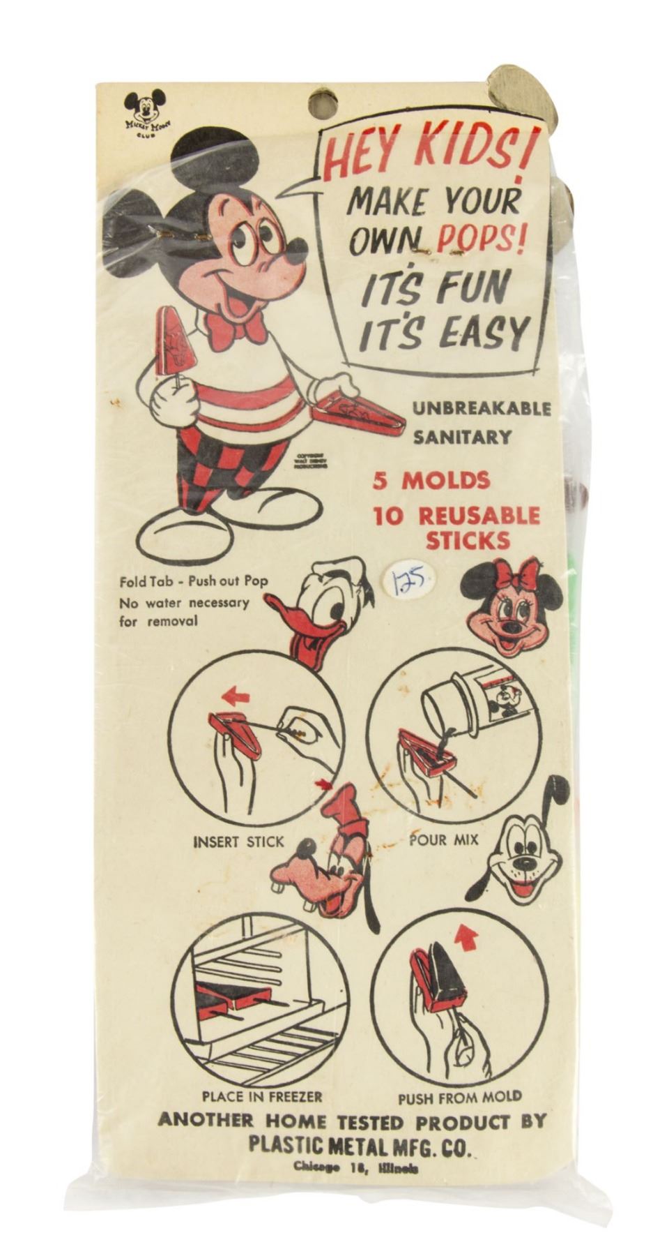 (Disneyland, c.1955) An original Disney-themed popsicle kit featuring the Mickey Mouse Club logo. The kit includes five character molds of Mickey, Donald, Cinderella, Pluto, and Tinker Bell, and 10 plastic popsicle holders. The kit measures 10.5"x4.5" and 1" thick in its original packaging and is in very good condition.