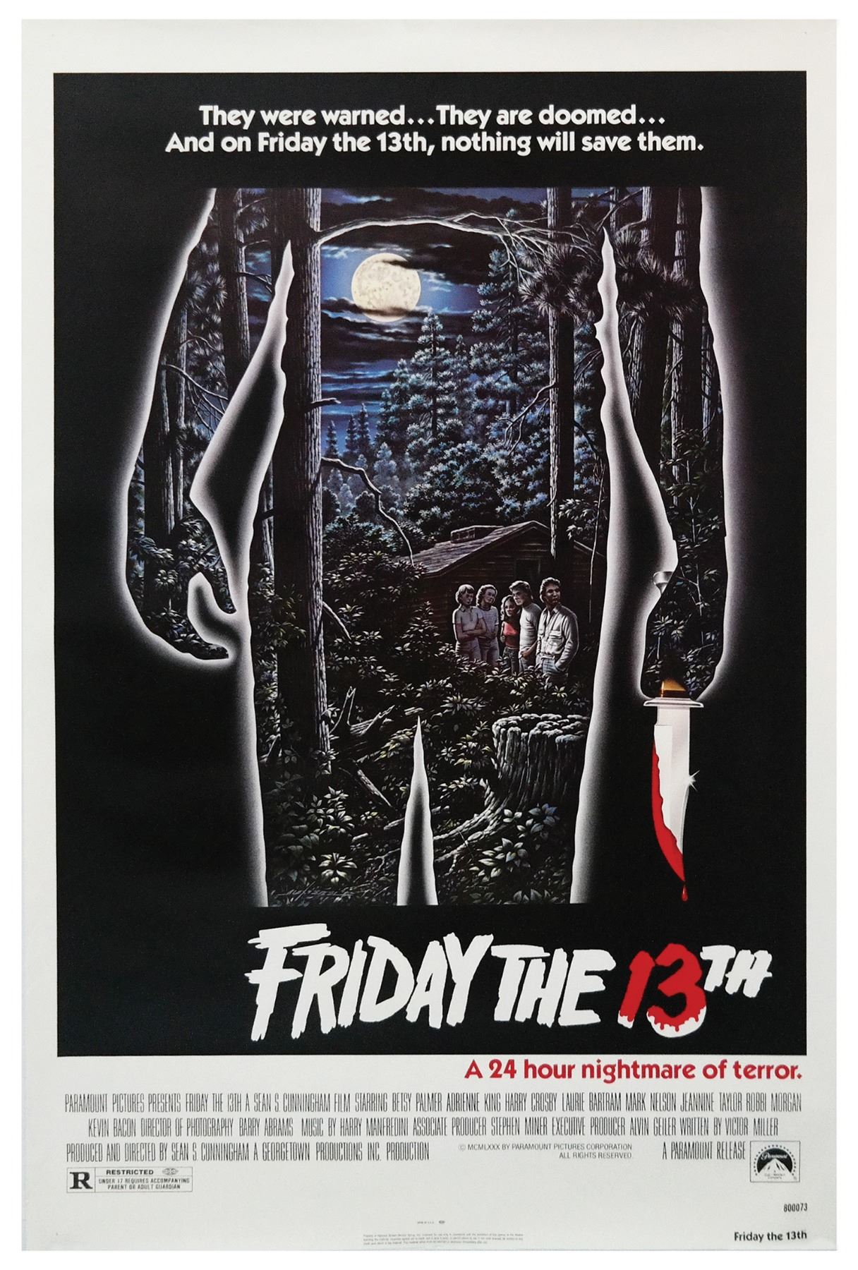 (Georgetown Productions, 1980) An original one sheet poster for Friday the 13th. The never-folded poster features the incredible artwork of Alex Ebel and measures 41"x27". The condition is very good with minor surface and edge wear.