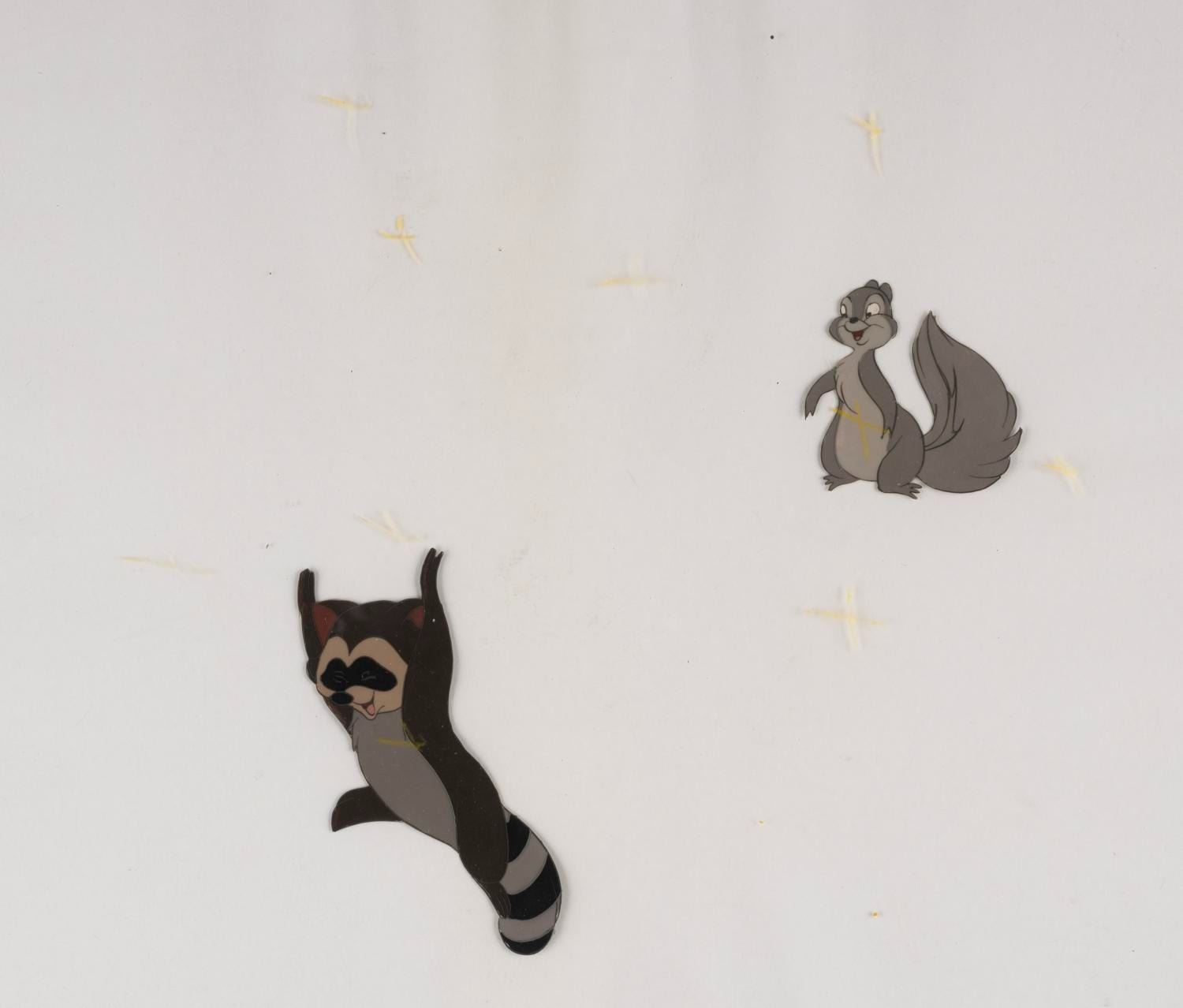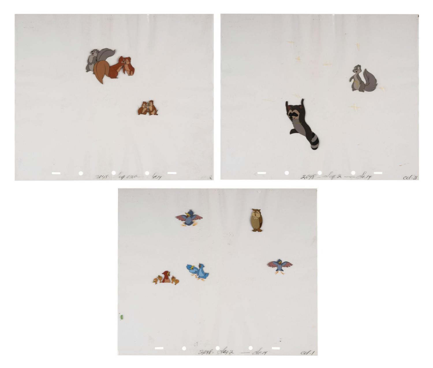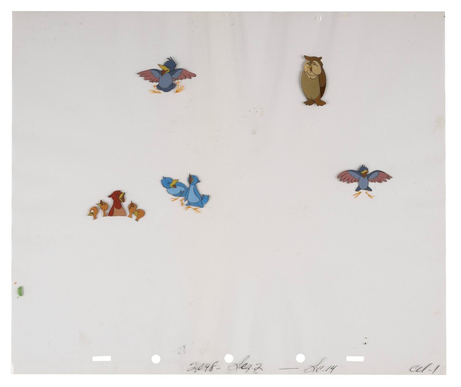(Disneyland, 1958) A set of three original production cels of birds and animals from the Walt Disney Presents episode, "From All of Us to All of You." The Christmas television special aired on December 15, 1958. With character image sizes measuring from 1" x 1" to 2" x 3.25" on untrimmed 10" x 12" cels, the artwork is in good condition with light smudges, stains, paint loss, and waviness to the cels.
