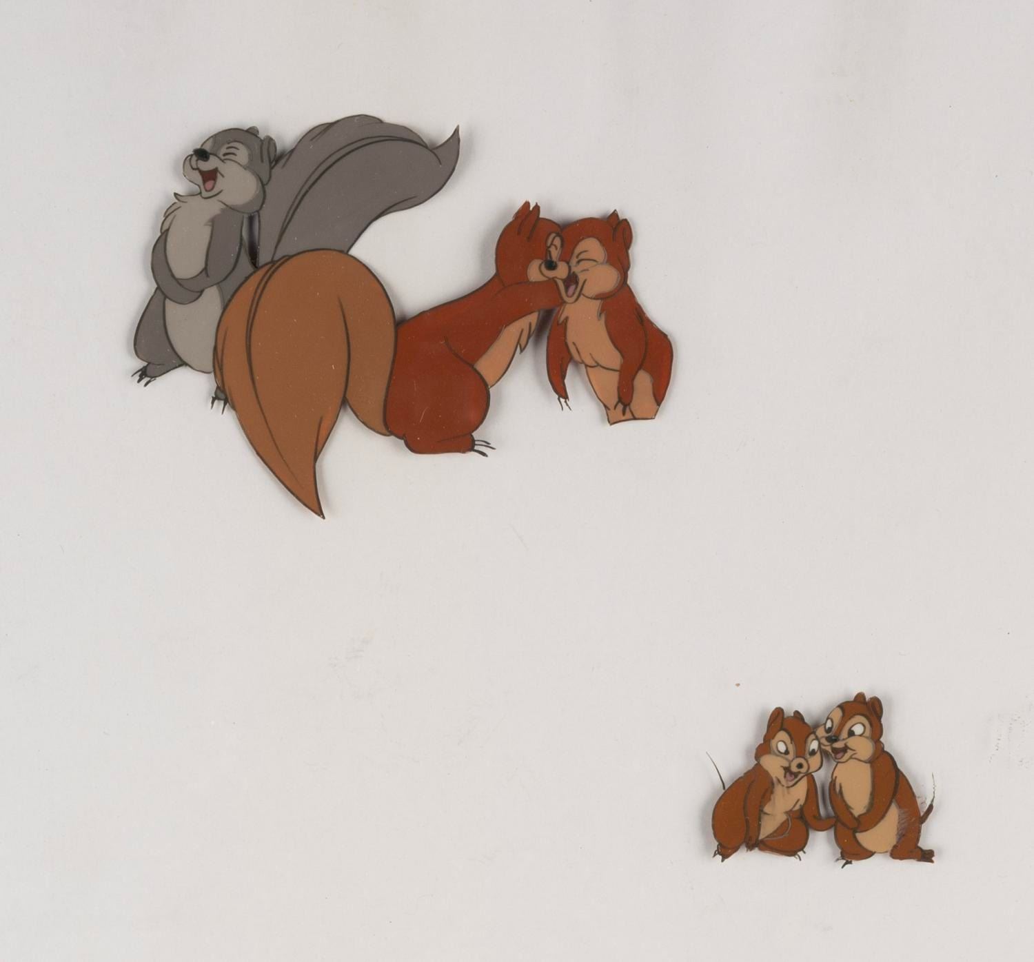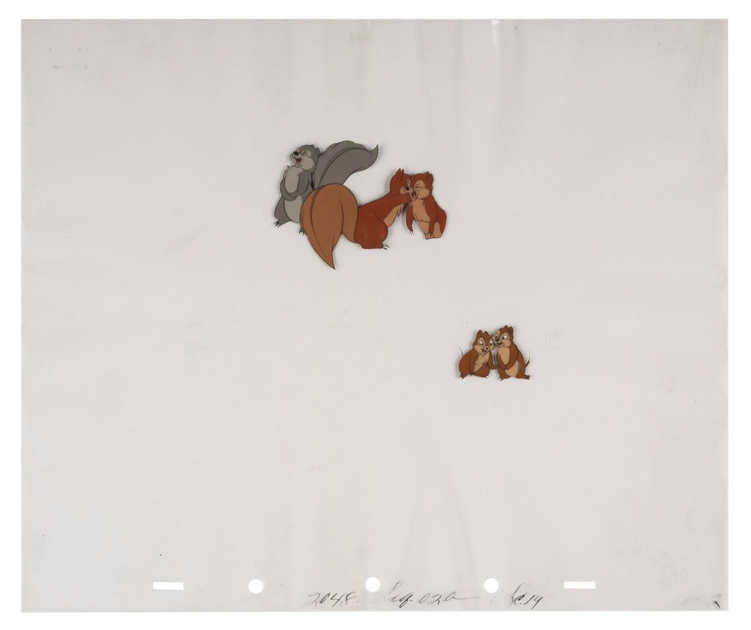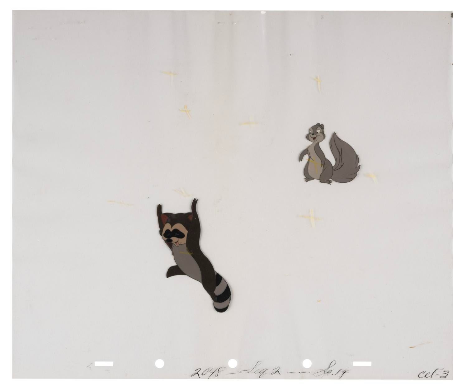 (Disneyland, 1958) A set of three original production cels of birds and animals from the Walt Disney Presents episode, "From All of Us to All of You." The Christmas television special aired on December 15, 1958. With character image sizes measuring from 1" x 1" to 2" x 3.25" on untrimmed 10" x 12" cels, the artwork is in good condition with light smudges, stains, paint loss, and waviness to the cels.