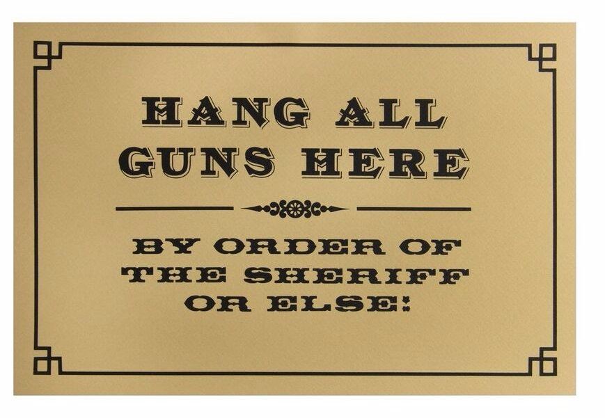 (Walt Disney World, 1980s) A silkscreened sign that reads "Hang All Guns Here - By Order of the Sheriff or Else!" and has a board backing. This sign is from the estate of Imagineer Ken Kerr, and was most likely a test for signage for Walt Disney World and Tokyo Disneyland. This item measures 12"x18" and is in fine condition.