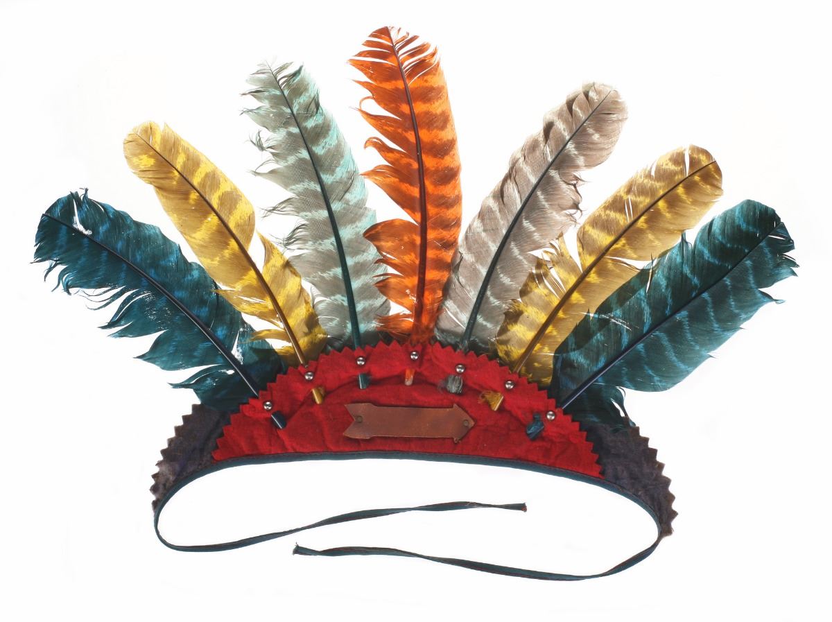 (Disneyland, 1964) Rare Frontierland "Indian Village" leather and feathered headdress. Constructed of felt, leather, and (7) colored feathers, the headdress features a leather "arrow" on the front. The inside of the headdress has the name of the original owner as well as the date, 2/8/64. Measures 12"x13.5", not including the straps. In very good condition with wear from age.