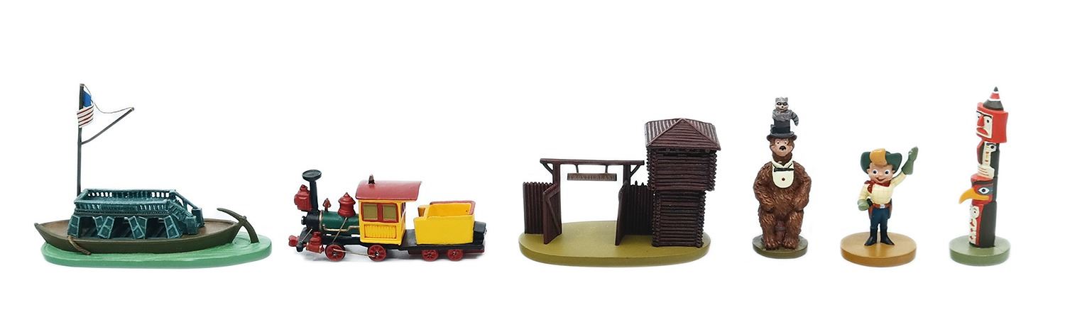 (Disneyland, 2005) This limited edition boxed set of Frontierland themed pewter miniatures was created by Kevin Kidney and Jody Daily for Disneyland's 50th anniversary. The set was limited to 1500 pieces and includes miniatures of: the Frito Kid, the Country Bears, the entrance to Frontierland, a train, a totem, and the Gullywhumper keelboat. The boxed set measures 7"x10" and 3.5" tall, and is in very good condition with some scuffing to the box.