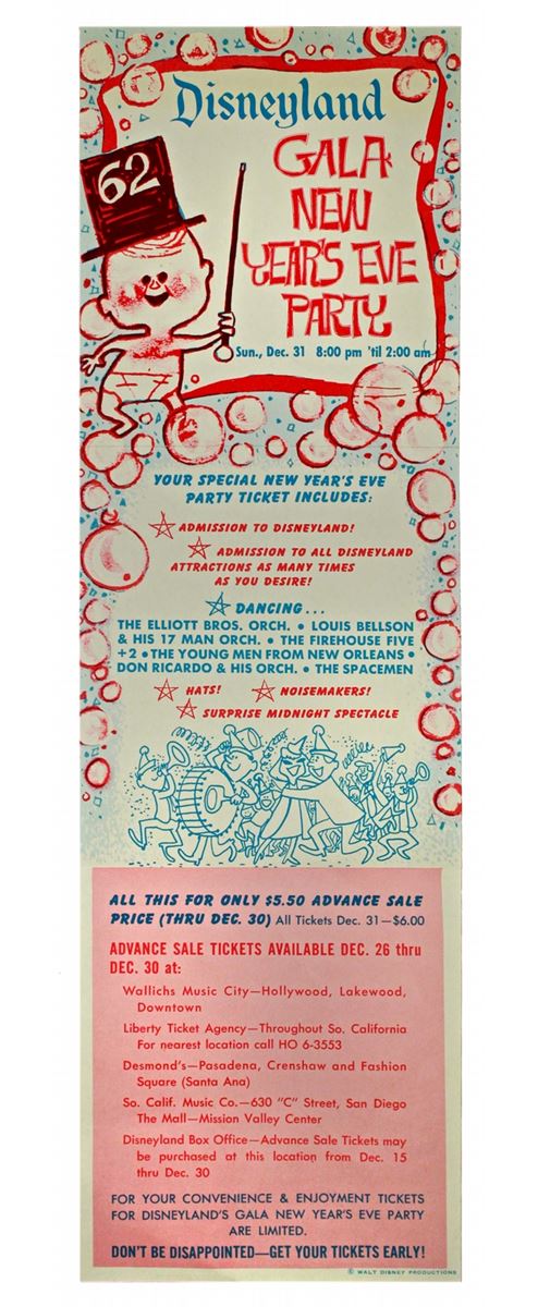 (Disneyland, 1962) Rare gate flyer announcing the 1962 New Year’s Eve party at Disneyland. Measuring 4.5 x 15 in. In very good condition.
