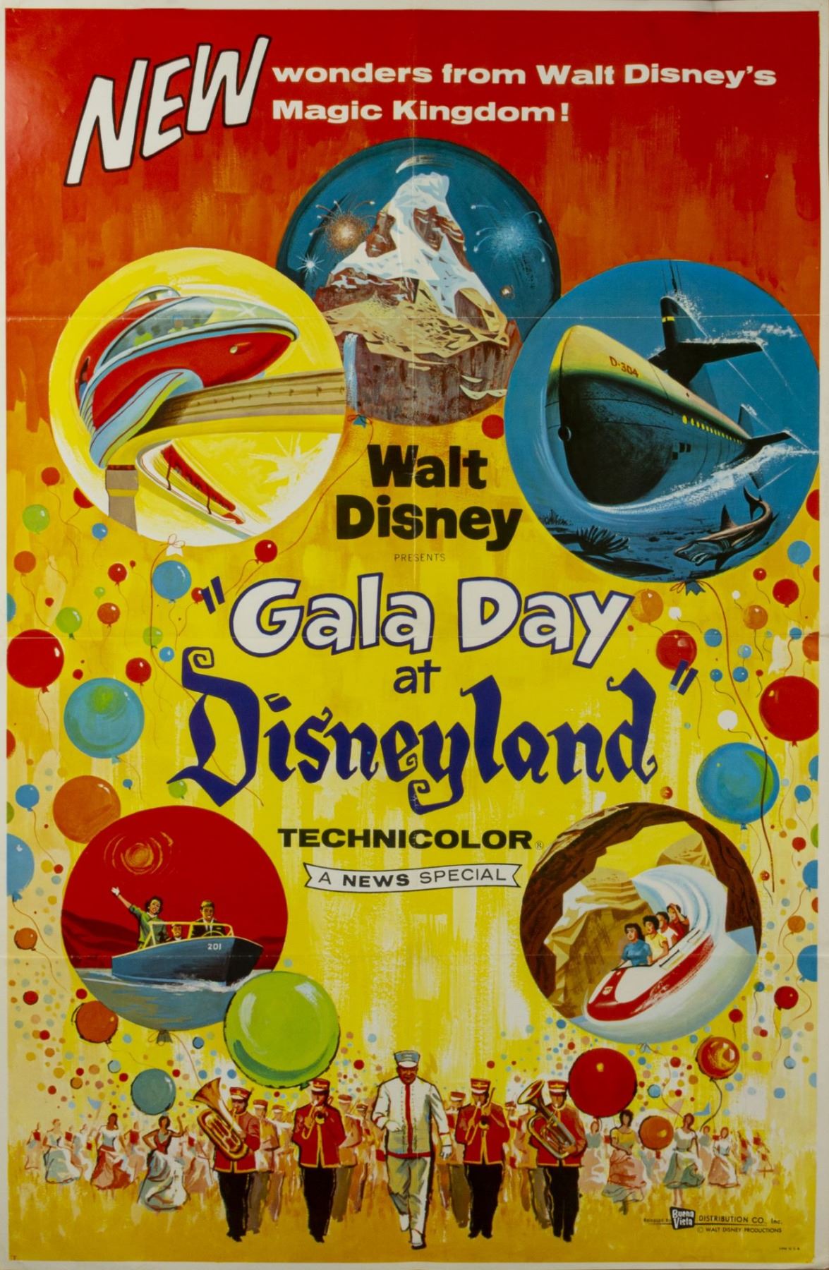 (Disneyland, 1959) An original one sheet theatrical release poster for Gala Day at Disneyland, a featurette that played in selected theaters nation-wide to promote the newest attractions at Disneyland. The poster measures 41.25"x27" and is in good condition overall, with some wear to the original fold-lines and a few spots of moisture discoloration. The reverse of the poster has a few spots that have been reinforced with tape, and the film's title has been written along the margin.