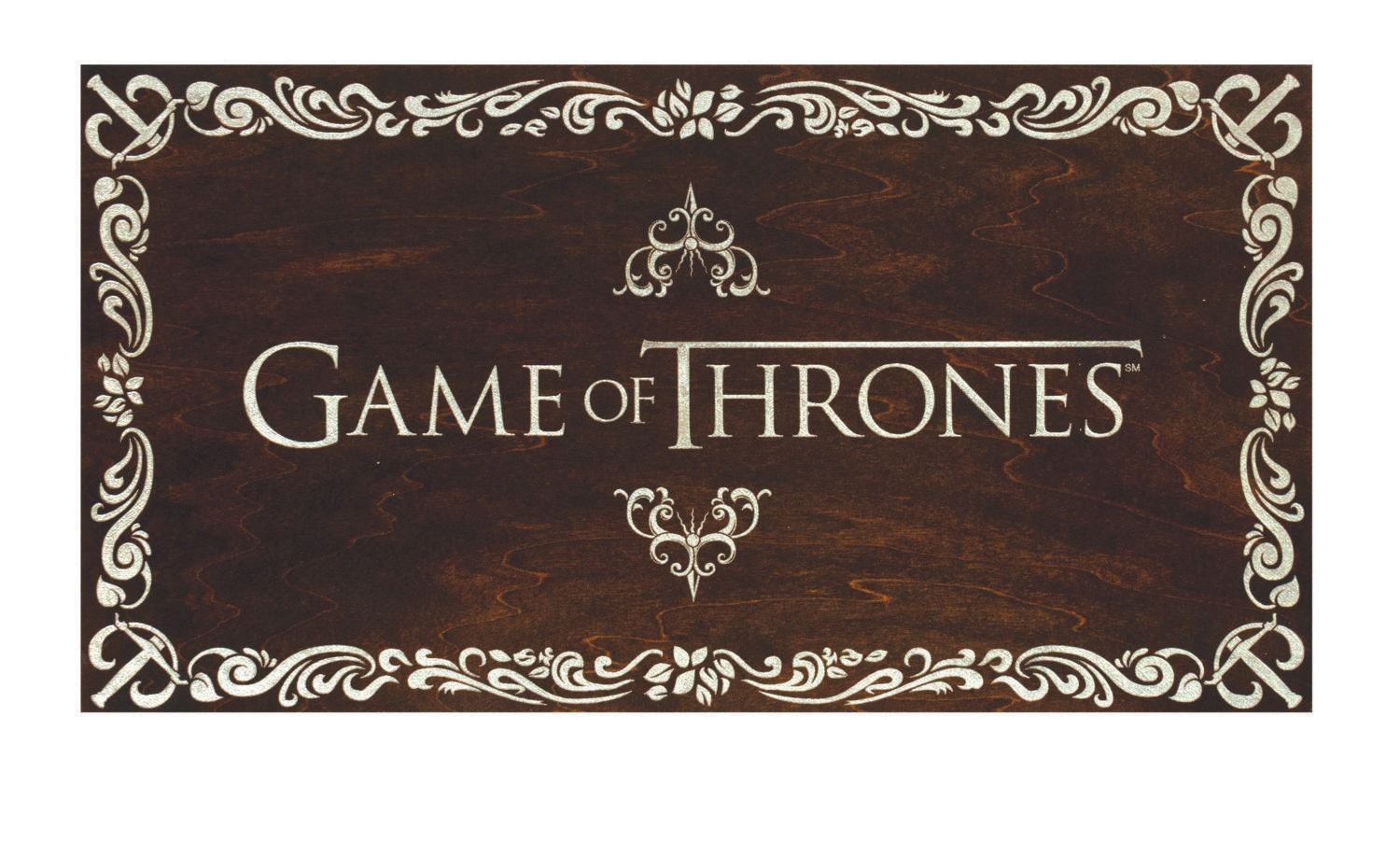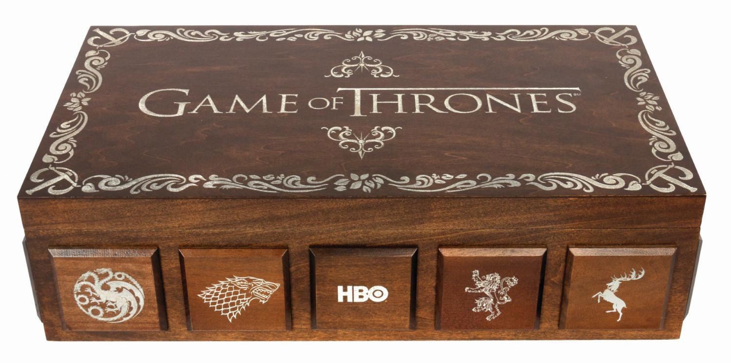 (HBO, 2013) A custom wooden chest created to promote Season 3 of the HBO’s fantasy epic, Game of Thrones. The top of the lid is laser etched with the series title logo and foliate border design. Wooden tiles etched with the sigils of prominent houses in Westeros are applied to all sides. The lid opens on concealed hinges to reveal a form fitted fabric insert containing still-shrink wrapped, unopened Blu Ray/DVD box sets of Seasons 1 and 2, as well a motion activated device that plays a snippet of the show’s iconic opening theme. A hidden button pops out a secret drawer in the front of the chest that contains a printed scroll designed to look like ancient hand-calligraphied parchment urging the reader to promote the show. The chest comes from the personal collection of Peter Green, whose design studio helped develop these scarce celebrity gifts for HBO. Measuring 5”x18.5” and 10” deep, the chest is in fine condition with minimal wear.