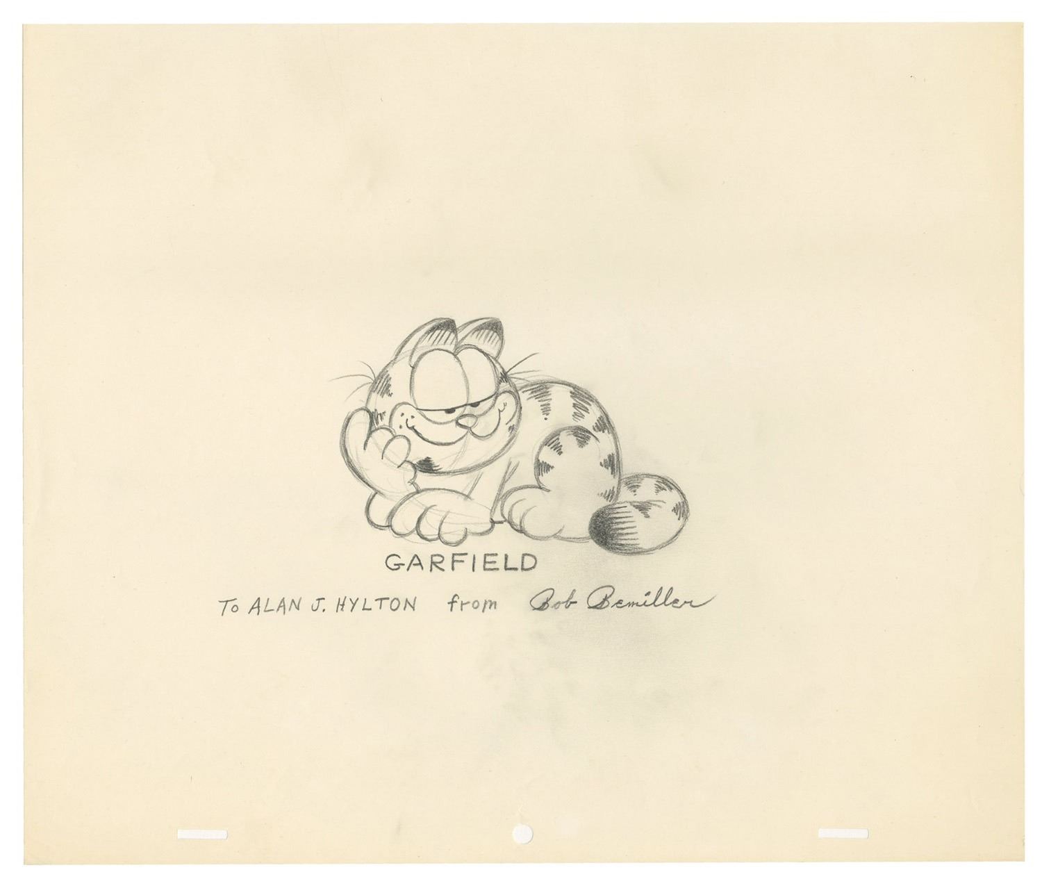 (Paramount, c.1984) An original drawing of Garfield by animator Bob Bemiller. Accomplished in pencil on 3-hole animation paper, the drawing is titled "Garfield" below the character and is personalized to Alan J. Hylton. Bemiller was known for his animation and directing work at a plethora of prominent studios between the 1930s and 1990s, including Fleischer Studios, Hanna-Barbera, Walt Disney, Bakshi, and Warner Bros. Notably, Bemiller animated on the popular television special "Garfield in the Rough." This original artwork has an image size of 3"x4.5" on 10.5"x12.5" animation paper and the condition is very good with little wear.