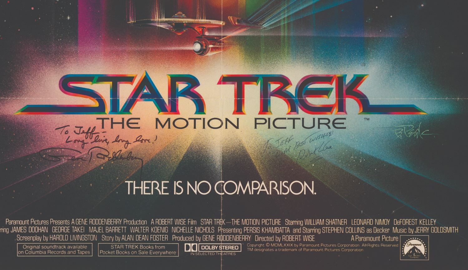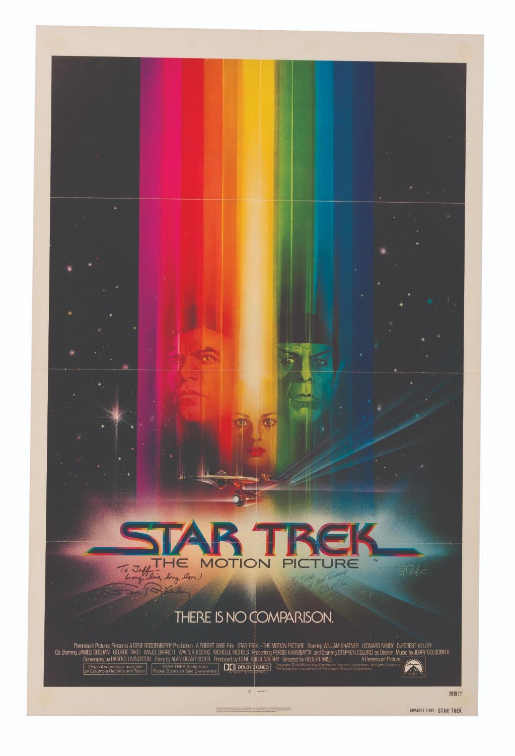 (Paramount Pictures, 1979) A one sheet poster for Star Trek: The Motion Picture, signed by Star Trek Producer and creator Gene Roddenberry, and the film's director Robert Wise. Both signed with dedication, with Roddenberry adding"Long live, long love!" Measuring 27"x41", the poster is in very good condition, with wear typical of age and handling, slight color shift to white areas, light wear along original folds, and a 1" split at the top center fold that is repaired with tape on the back.