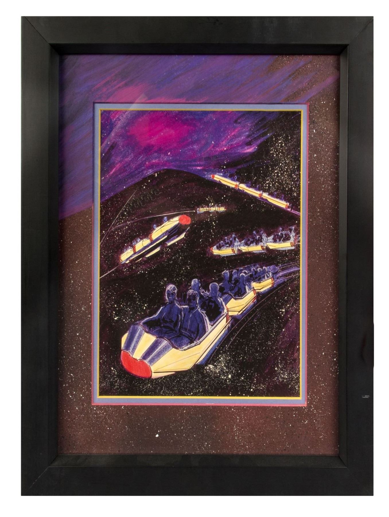 (Disneyland, 1998) A custom-framed print featuring Imagineer George McGinnis' concept art for Disneyland's "Space Mountain" attraction. The concept depicts the stylish "Space Mountain" attraction vehicles and comes double-matted with mats that are hand-painted to match the artwork. The print has an image size of 9.75"x7.5" within its 16"x13" frame. The condition is very good.
