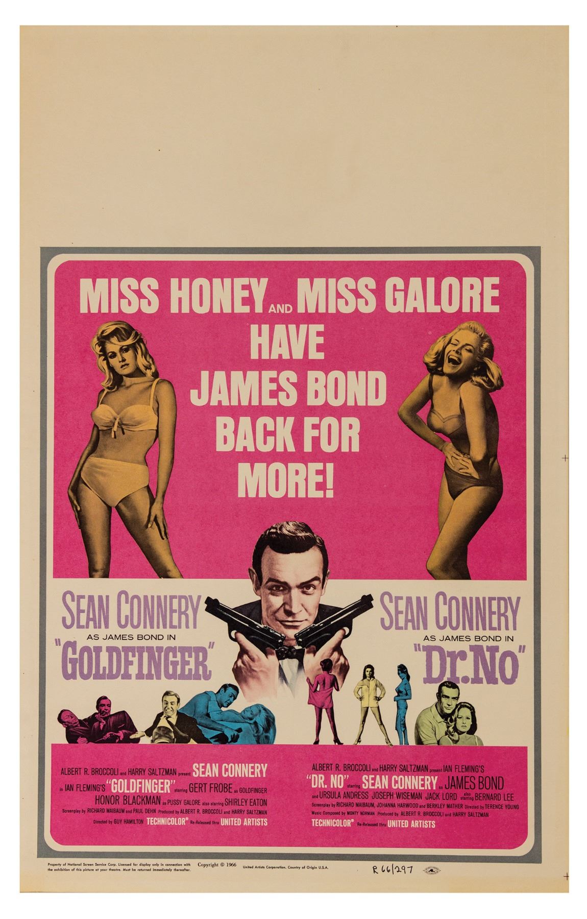 (United Artists, 1966) A window card for the theatrical re-release of the third James Bond film, Goldfinger, starring Sean Connery. Posters like these would be displayed at movie theaters, and the area along the top edge could be used to display special showing dates and times. Measuring 22"x14", the card is in very good overall condition.