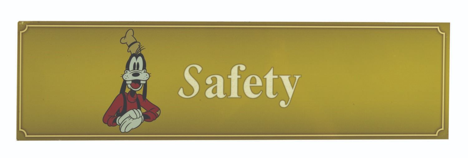 (Disneyland, c.2010s) A behind-the-scenes Disneyland sign reminding Cast Members that safety is among the Park's core tenants. Consisting of a glossy print applied to a metal backing, the sign features an image of Goofy with a stately retro border and lettering. The piece retains adhesive strip remnants on the reverse from previous mounting. Measuring 6"x22", the sign is in very good condition with some scuffing, scratches, and finish marring.