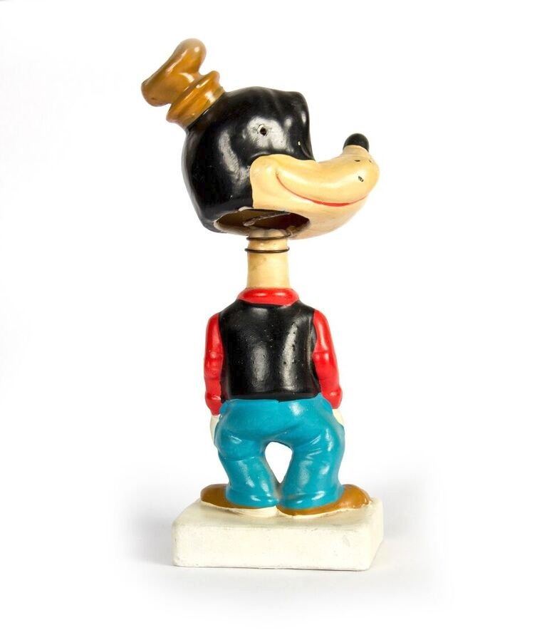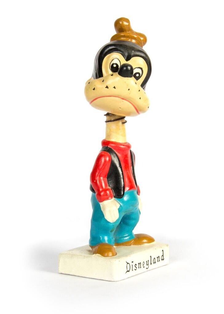 (Disneyland, c.1960s) An early Goofy bobble head souvenir from Disneyland. This figure reads "Disneyland" along the base and has the early turquoise Disneyland logo on the bottom. This item measures 7.5" tall and is in good condition with some wear throughout and is missing its ears.