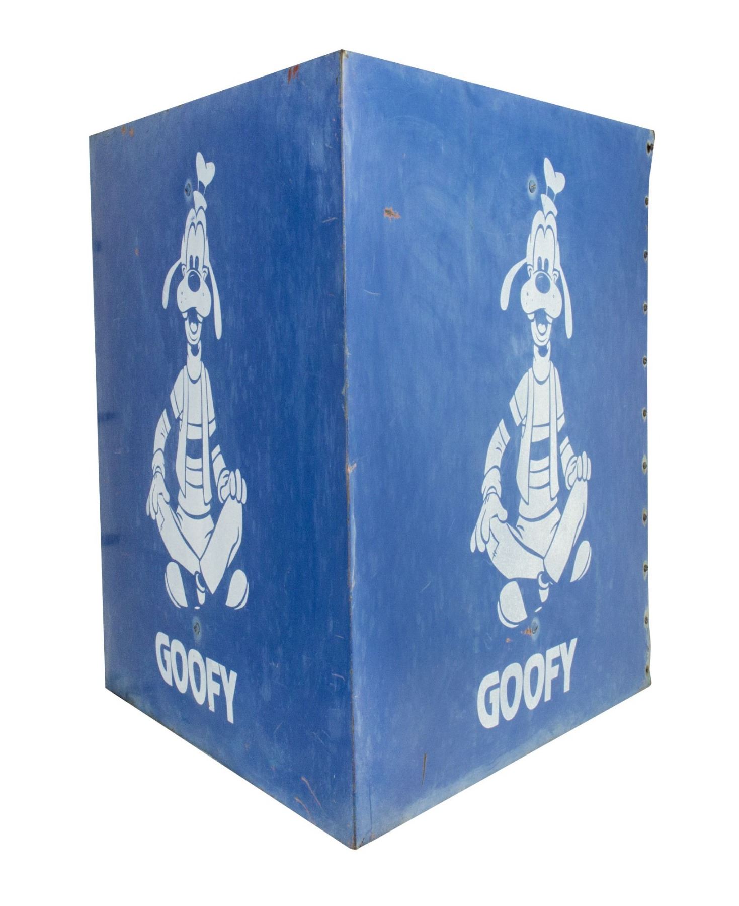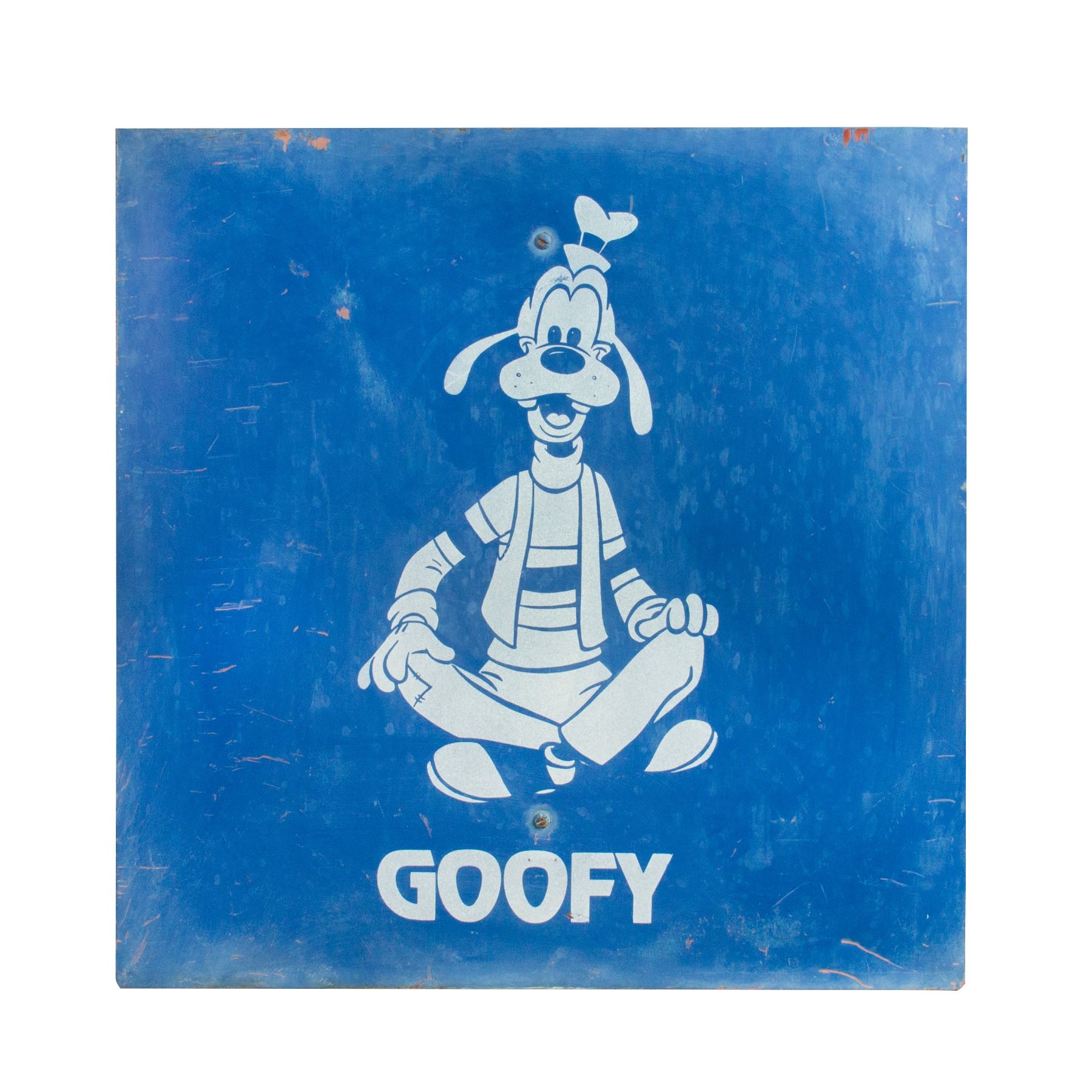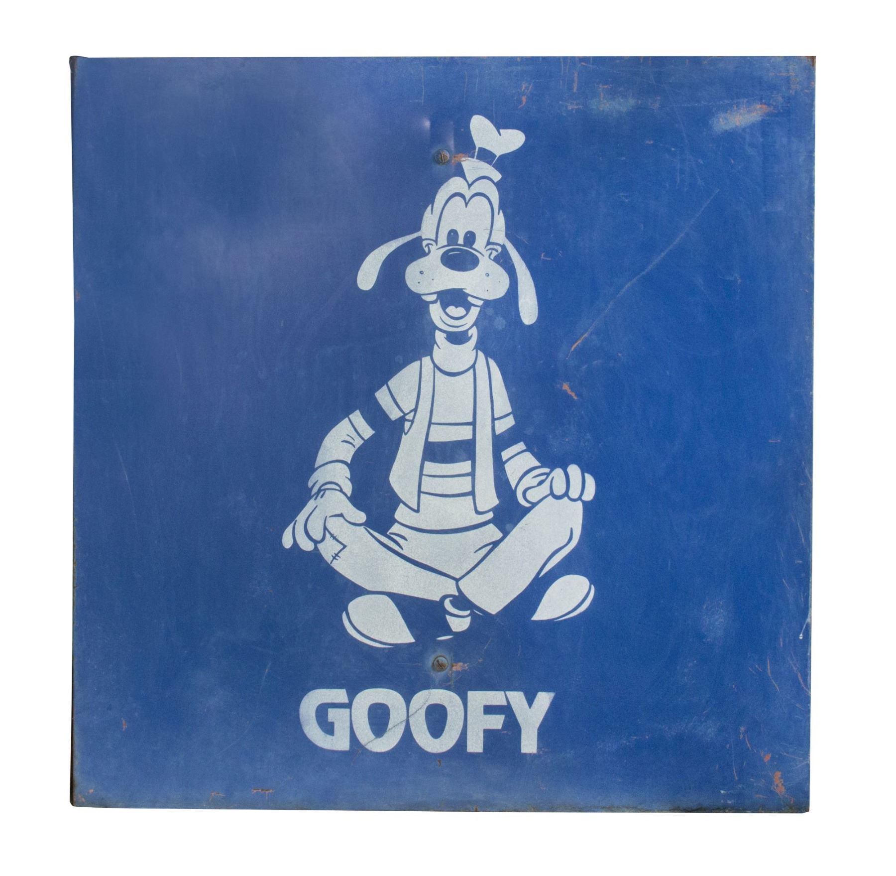 (Disneyland, 1990s) A large triangular metal parking lot sign from Disneyland. Each of the three-sides of this sign features imagery of the character Goofy and each side measures 30"x30". The condition is good with some small dings and wear throughout. There is some minor lifting to the seam between two of the sides.