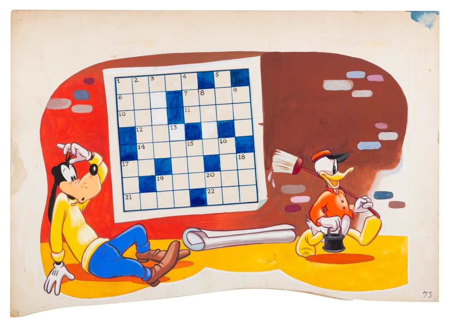 (Disney, 1950s-60s) The original production artwork for a crossword puzzle featuring Goofy and Donald Duck. Painted in gouache with an image size of 6" x 9" on 7.5" x 10" artist board, the piece displays in very good condition, with a faint 1.5" spot of soiling by Donald's foot, and wear to the edges from production use and age that does not affect the image.