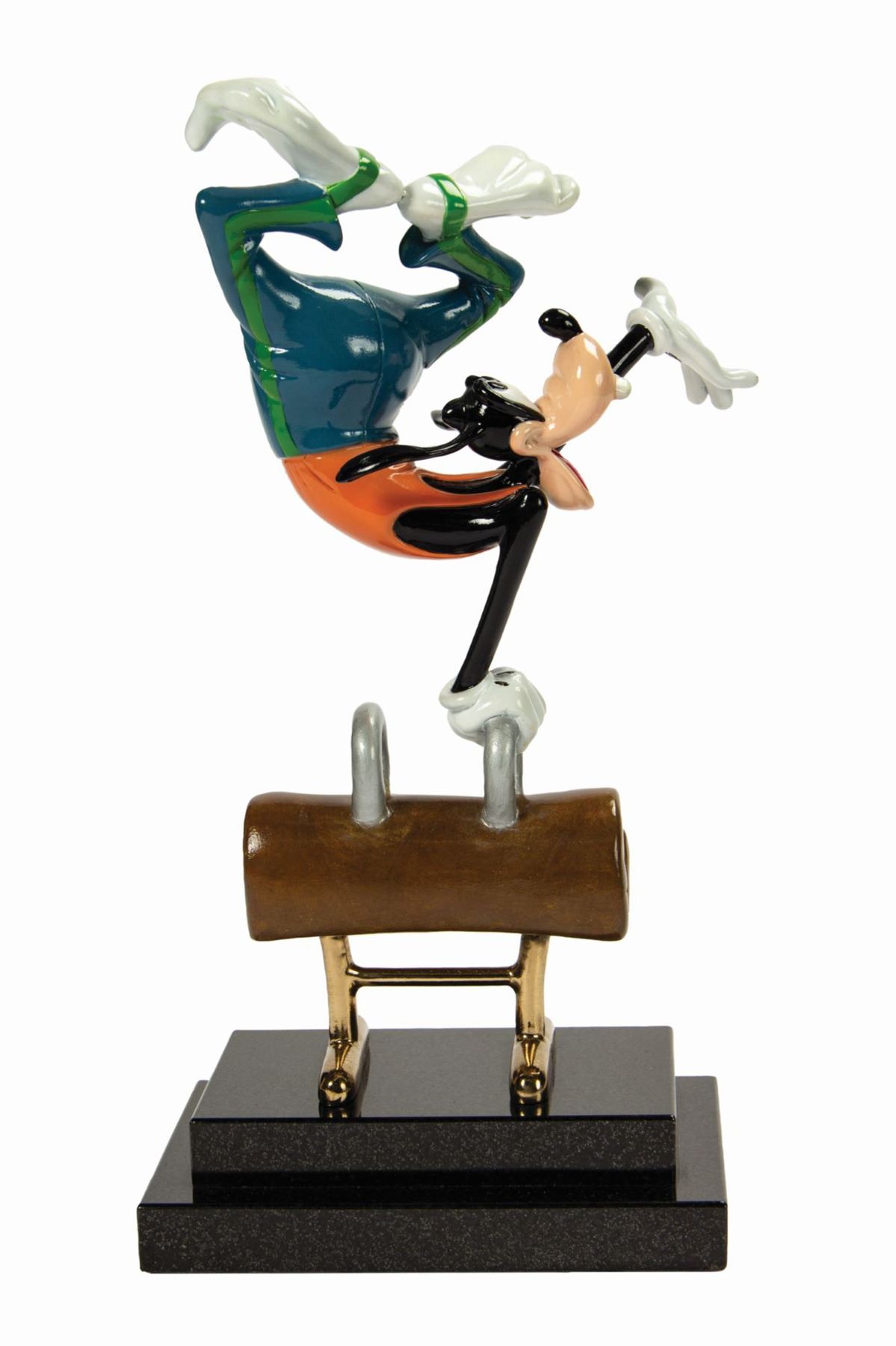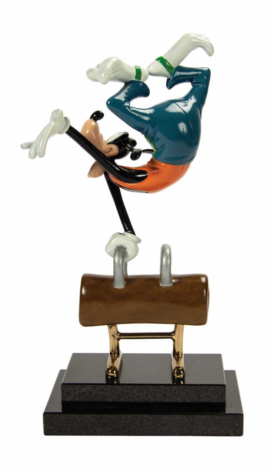 (Disney, c.1990s) A stunning bronze sculpture by renowned Disney artist and sculptor, Bill Toma. Depicting Goofy on a pommel horse, this sculpture was created by Toma as a prototype in a line of five proposed bronze character sculptures he intended to introduce to Disney collectors world-wide. Ultimately, this piece became one of only two samples ever created, both with different finishes and highlighted colors. Measuring 12" tall, the piece is in very good condition with minor surface wear from use as Toma's prototype.