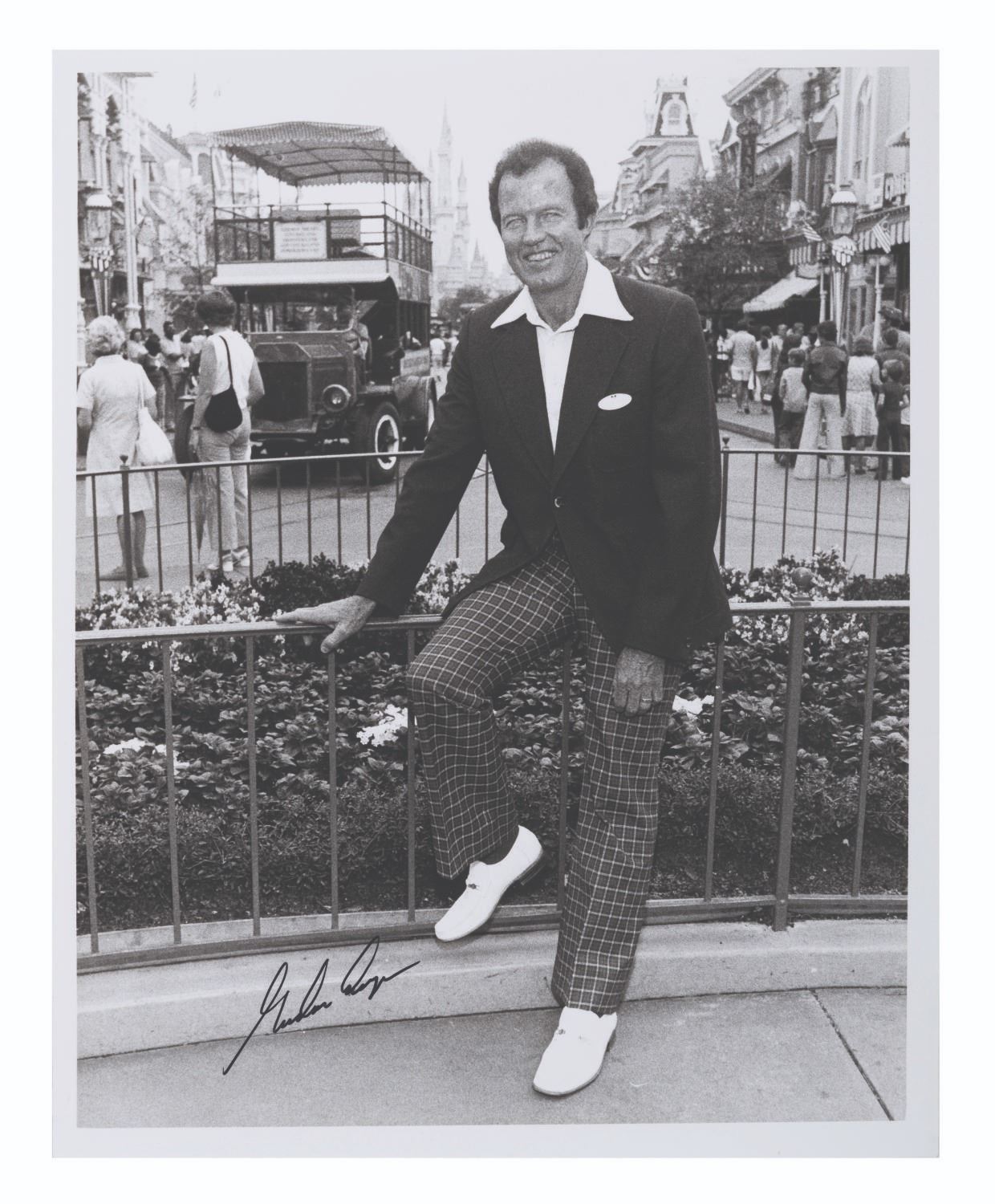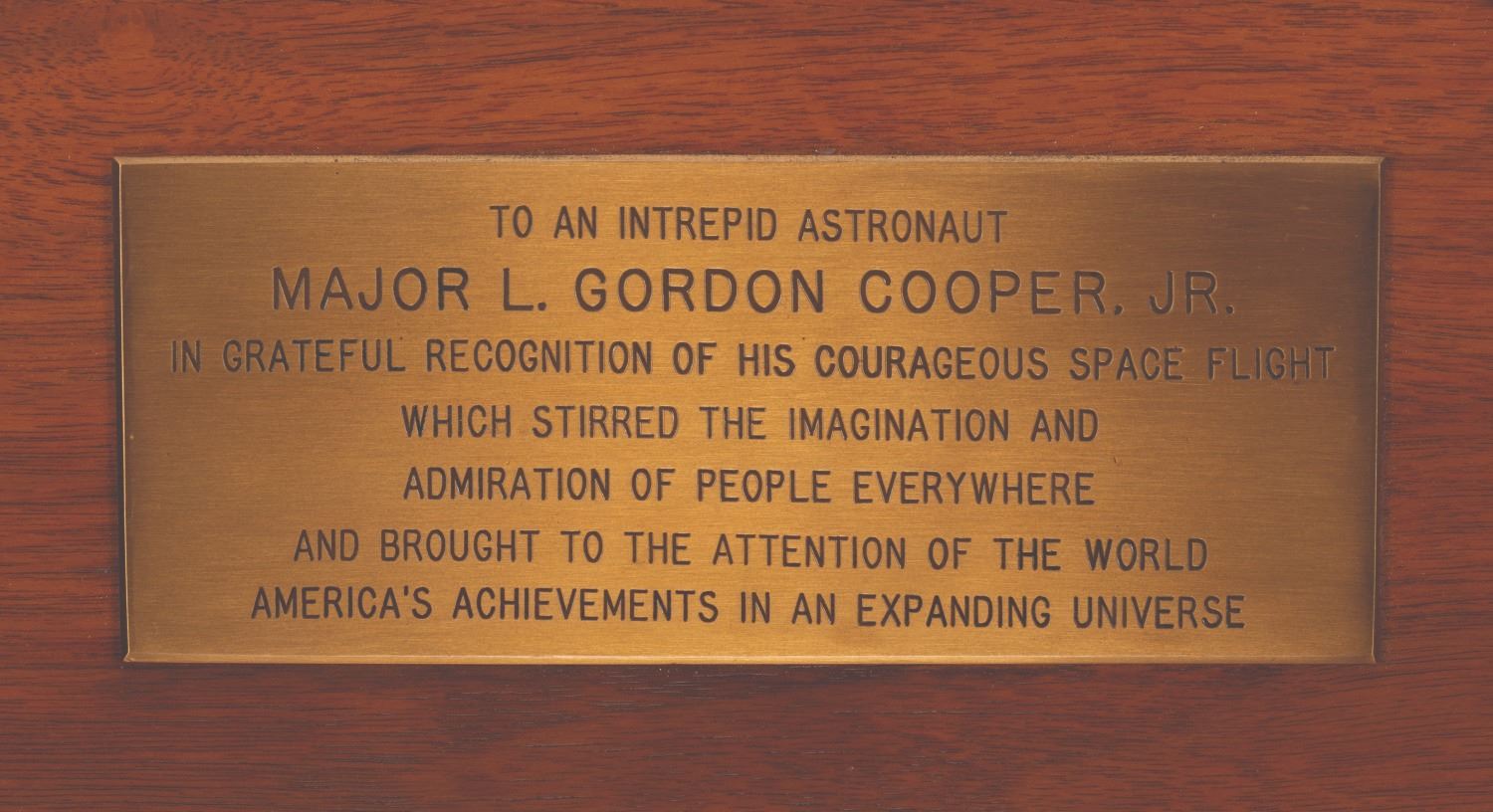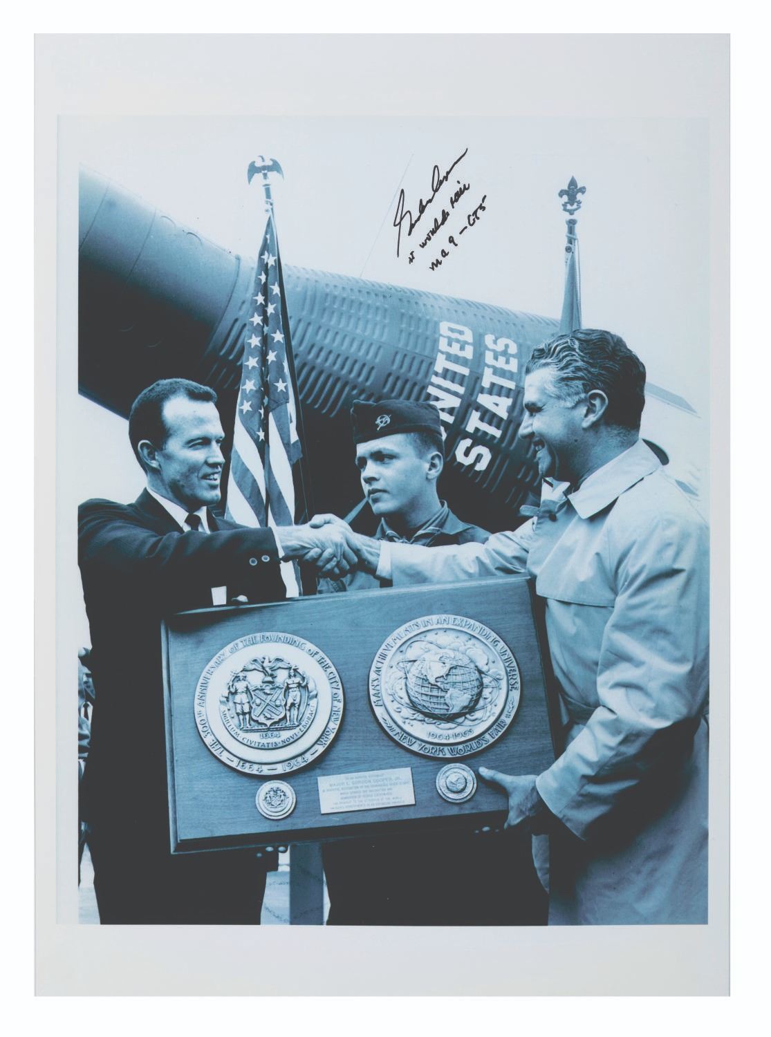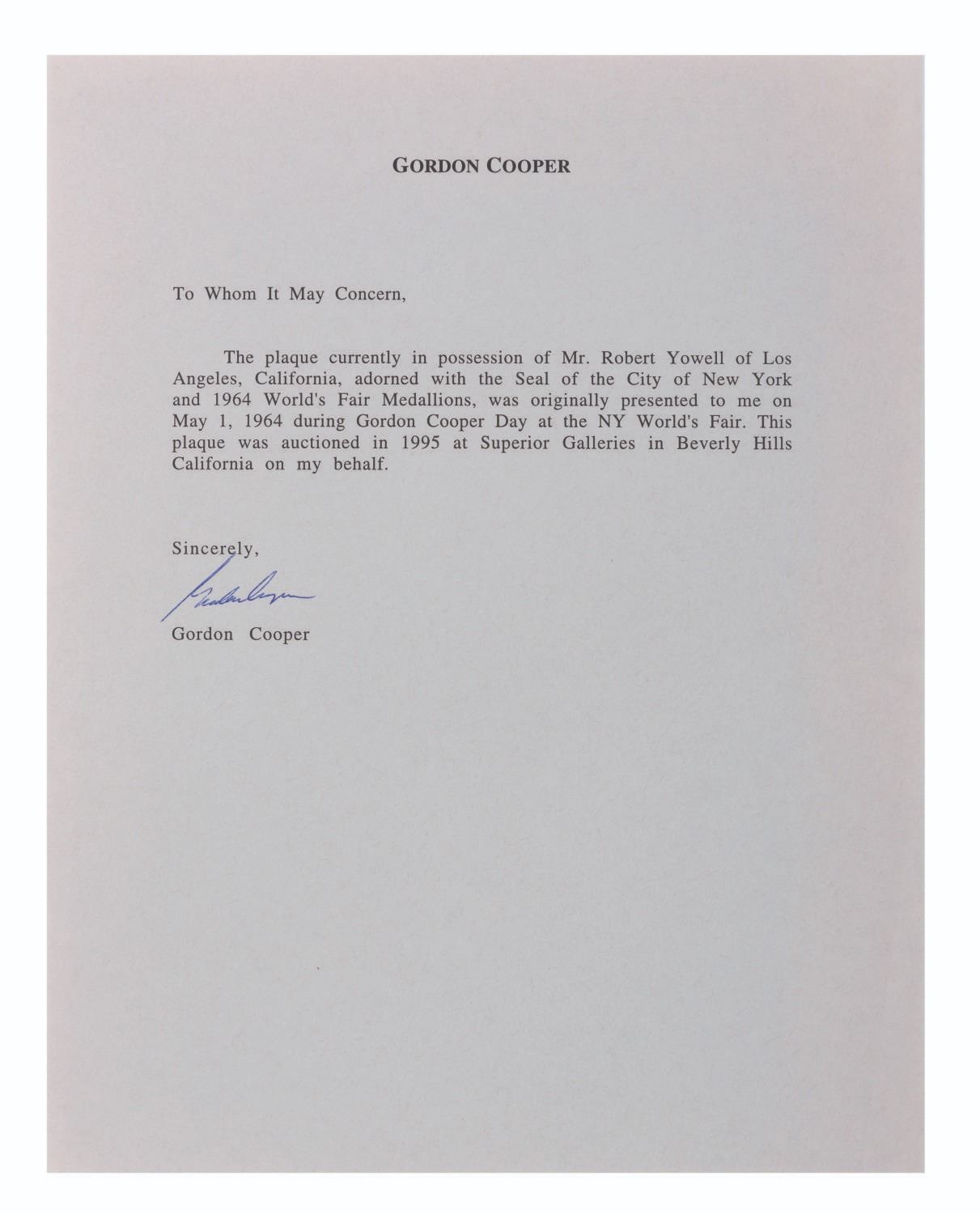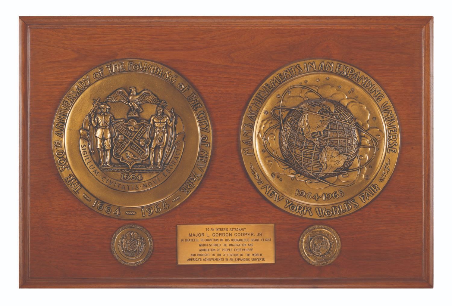 (New York World's Fair/Gordon Cooper, 1964) An impressive one-of-a-kind plaque presented to astronaut Gordon Cooper at the New York World's Fair. May 1st, 1964 was proclaimed Gordon Cooper Day, in honor of his achievements in the Mercury program and the upcoming Gemini mission. Before the crowds at the World's Fair U. S. Space Park, Fair Vice President William Berns presented Cooper with this plaque bearing the bronze seals of the City of New York and of the World's Fair, both in 10.75" and 2.75" diameter. At center is a 6.5"x2.75" plaque with the dedication. Included with the plaque is a pair of photos signed by Gordon Cooper: an 8.5"x12" digital print of the plaque presentation, and an archival 1975 Disney Studio 8"x10" signed photo of Gordon Cooper at Walt Disney World, from his time as a Vice President in Imagineering of research and development of EPCOT. Measuring 18.5"x28"x2", the wooden and bronze plaque is in fine condition, with slight scuffs to the outer edges only. The photos with autographs are in fine condition.