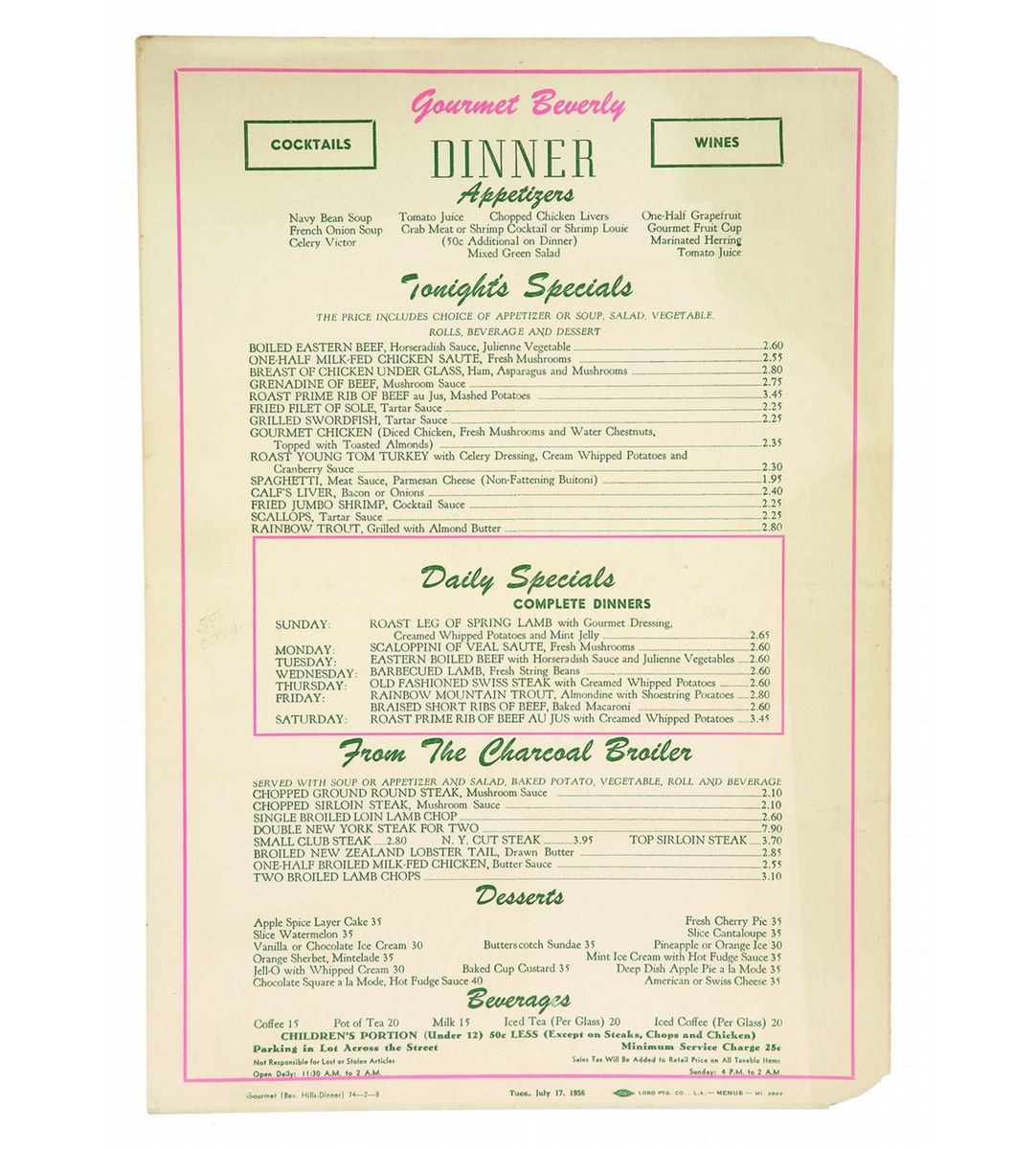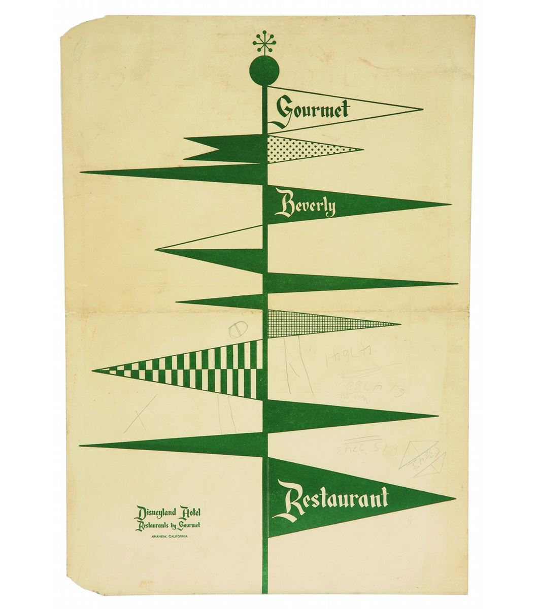 (Disneyland, 1956) A menu from the Gourmet Beverly restaurant at the Disneyland Hotel. The menu is dated "Tues., July 17, 1956", the one year anniversary of Disneyland. Features pennant imagery in green on the front, with the menu options in green and pink on the back. Measures 15"x10.5". In good condition with a horizontal fold mark down the middle. Some mild edge wear, including two small corner tears. Some pencil marks and notes throughout.