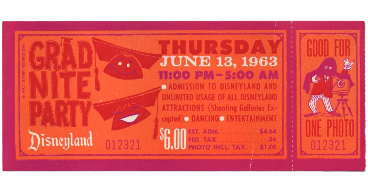 (Disneyland, 1963) Rare admission and photo ticket from Disneyland’s presentation of Grad Nite on Thursday, June 13th, 1963. Rare in that this large, beautiful ticket was made for one night only. The 2.5 x 6 in. unused ticket was removed from a scrapbook and retains some residue on reverse, otherwise, in very good condition.