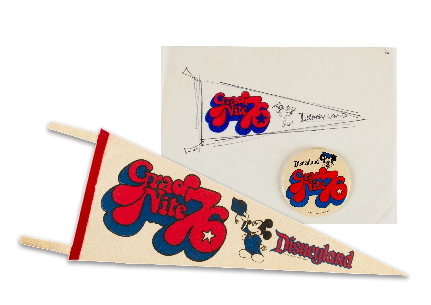 (Disneyland, 1976) A beautiful concept illustration for a pennant for Disneyland's Grad Nite '76. This illustration comes with the finalized pennant and a large button from the same Grad Nite. The concept illustration is accomplished in ink on vellum and has a matching color scheme to the button. The illustration measures 9"x12", the pennant measures 30" long, and the button measures 3.5" in diameter. The set is in very good condition with some creasing to the corners of the illustration and some areas of the pennant.